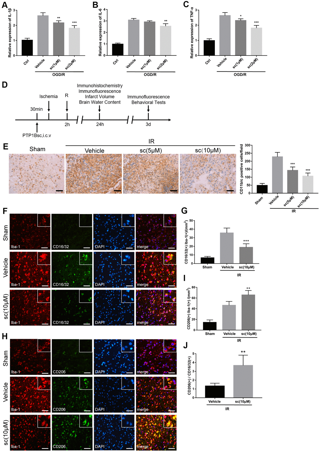 We found that 2 μM of PTP1Bsc treatment significantly decreased the mRNA levels of IL-1β, IL-6, and TNF-α (relative mRNA expression level: IL-1β, P < 0.001; IL-6, P < 0.01; TNF-α, P < 0.001; all compared to vehicle groups; Figure 2A–2C) in rat primary microglial cells 24 h after OGD/R insult. An in vivo experiment (outlined in Figure 2D) further showed that intraventricular administration of both 5 and 10 μM PTP1B inhibitor 30 min prior to IR injury effectively decreased the number of activated microglia (CD11b/c+) in the ipsilateral cerebral cortex after cerebral IR injury (P < 0.001 vs. vehicle group, Figure 2D, 2E). With prolonged reperfusion (72 h, Figure 2D), 10 μM PTP1Bsc treatment significantly reduced the number of Iba1(+) CD16/32(+) cells (M1 microglia; P < 0.001 vs. vehicle group, Figure 2F, 2G), while the number of Iba1(+)/CD206(+) cells was significantly increased (M2 microglia; P < 0.01 vs. vehicle group, Figure 2H, 2I) as well as the M2-to-M1 ratio (P < 0.01 vs. vehicle group, Figure 2J) in the ipsilateral cerebral cortex.