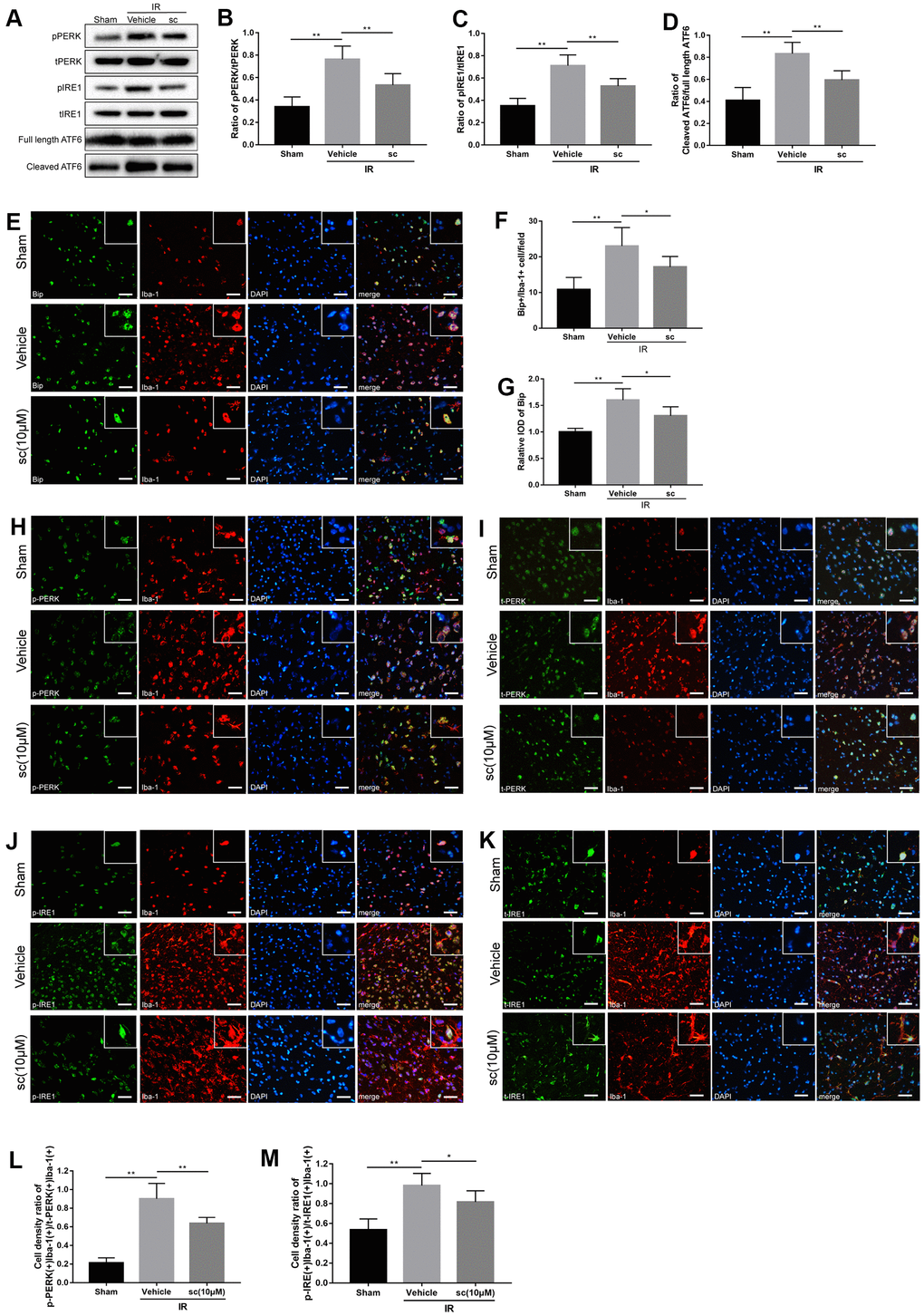To further investigate the cerebral IR-induced ER stress change in microglia, another ER stress marker, the heavy chain binding protein (Bip), was used and double immunofluorescence detected Bip(+)/Iba-1(+), phospho-PERK(+)/Iba-1(+), total-PERK(+)/Iba-1(+), phospho-IRE1(+)/Iba-1(+), and total-IRE1(+)/Iba-1(+) in the sham, vehicle, and PTP1Bsc (10 μM) treatment groups (Figure 3E, 3H–3K). Cell density was calculated by double-positive cell counting per field. Cerebral IR injury significantly enhanced the cell density of Bip(+)Iba-1(+), relative overall IOD of Bip, as well as the cell density ratio of phospho-PERK(+)Iba1-1(+)/total-PERK(+)Iba-1(+) and phospho-IRE1(+)Iba1-1(+) / total-IRE1(+)Iba-1(+) (P < 0.01, all compared to the sham group; Figure 3F, 3G, 3L, 3M) in the ipsilateral rat cerebral cortex, indicating a significant elevation of microglial and overall ER stress after IR injury. PTP1Bsc (10 μM) treatment significantly mitigated IR injury-induced microglial and overall ER stress, evidenced by decreased cell density of Bip(+)Iba-1(+) [P < 0.05 vs. vehicle group, Figure 3F], relative overall IOD of Bip [P < 0.05 vs. vehicle group, Figure 3G], and decreased cell density ratio of p-PERK(+)Iba1-1(+)/t-PERK(+)Iba-1(+) [P < 0.01 vs. vehicle group, Figure 3L] and p-IRE1(+)Iba1-1(+) /t-IRE1(+)Iba-1(+) [P < 0.05 vs. vehicle group, Figure 3M].