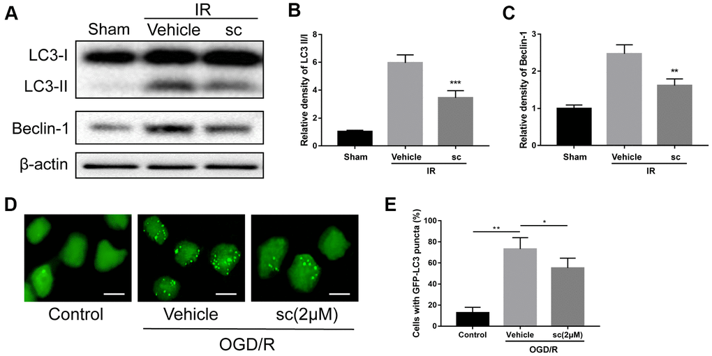 To determine the effect of PTP1B inhibitor on ischemia-induced microglial autophagy, GFP-LC3 stable-expressing BV-2 cells were generated, and autophagy status was evaluated by calculating the percentage of cells containing GFP-LC3 puncta. Three hours after OGD/R injury, a dramatic increase in GFP-LC3 puncta was observed, and 2 μM PTP1Bsc treatment significantly reduced the accumulation of GFP-LC3 puncta (P < 0.05 vs. vehicle group; Figure 4D, 4E), indicating effective attenuation of OGD/R-induced microglial autophagy. Together, these data suggest that PTP1B inhibitor treatment significantly alleviated IR-induced overall and microglial autophagy.