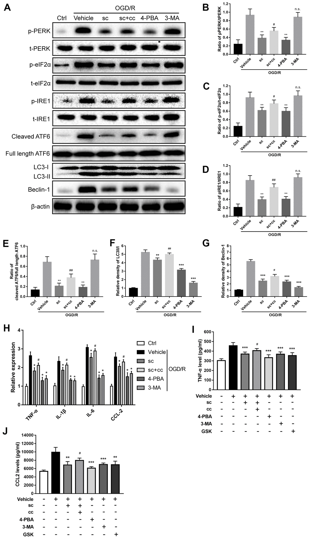 It has been reported that generation of autophagy is triggered by upstream ER stress pathways [24, 32, 33], and the ER stress-autophagy axis is involved in cocaine-induced microglial activation [18]. First, to determine the role of ER stress in the induction of autophagy in the context of IR injury, as well as its effect on OGD/R-induced microglial activation, the specific ER stress inhibitor, 4-phenyl butyrate (4-PBA), and the specific autophagy inhibitor, 3-methyladenine (3-MA), were applied. Western blot analysis showed that OGD/R injury resulted in significant upregulation of ER stress and autophagy activity (Figure 5A, 5B, 5D–5G) in primary microglia. Suppression of ER stress by 4-PBA not only inhibited OGD/R-induced upregulation of the phospho-PERK/total-PERK, phospho-IRE1/total-IRE1, and cleaved ATF6/full length ATF6 ratios (P < 0.01, all compared to vehicle group; Figure 5B, 5D, 5E), but also suppressed OGD/R-induced upregulation of autophagy as evidenced by the decreased ratio of LC3-II/I (P < 0.001 vs. vehicle group; Figure 5F) and beclin-1 protein ratios (P < 0.001 vs. vehicle group; Figure 5G); however, 3-MA treatment only attenuated autophagy (LC3-II/I ratio: P < 0.001 vs. vehicle group, Figure 5F; beclin-1: P < 0.001 vs. vehicle group, Figure 5G), but had no significant effects on ER stress proteins (P>0.05 vs. vehicle groups for phospho-PERK/total-PERK, phospho-IRE1/total-IRE1, and cleaved ATF6/full length ATF6 ratios; Figure 5B, 5D, 5E). Then, we examined the role of the microglial ER stress-autophagy axis on microglial activation after an OGD/R insult. Both 4-PBA and 3-MA significantly attenuated IR injury-induced microglial activation, as evidenced by a significant decrease in TNF-α, IL-1β, IL-6, and CCL-2 mRNA expression (P < 0.05 vs. vehicle group; Figure 5H) as well as a decline in the levels of TNF-α (P < 0.001 vs. vehicle group; Figure 5I) and CCL2 protein (P < 0.001 vs. vehicle group; Figure 5J). Together, these results indicated that microglial ER stress is the upstream event after OGD/R insult, and the ER stress-autophagy axis mediates OGD/R-induced microglial activation.