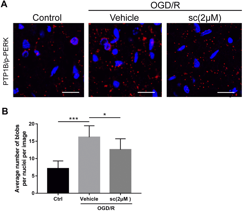 Because the interaction between PTP1B and phospho-PERK had been reported in several tissue types to trigger ER stress [34], we used the proximity ligation assay (PLA) probe to determine the protein interaction between PTP1B and phospho-PERK in primary microglia upon OGD/R injury, and the effect of PTP1B inhibition on the protein interaction. PLA is a technique capable of identifying interactions between two proteins in fixed tissue and cell samples. By using the corresponding primary and secondary antibodies (PLA probes) that bind to primary antibodies, the protein interaction can be detected if two proteins are in close association (when PLA probes are in close proximity [< 40 nm]) to generate a fluorescent signal and visualization as fluorescent blobs, which can be further quantified on microscopy [35].