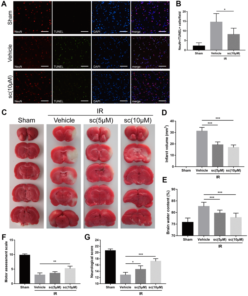 Terminal deoxynucleotidyl transferase dUTP nick end labeling (TUNEL) assay was performed to identify cells undergoing apoptosis. PTP1Bsc significantly attenuated neuronal death 24 h after IR injury compared with the IR group (P < 0.05 vs. vehicle group, Figure 7A, 7B). Infarct volume assessment by TTC staining and measurement of brain water content were performed to evaluate overall neuronal damage. Both 5 and 10 μM of PTP1Bsc administration significantly diminished infarct volume (P < 0.001 vs. vehicle group; Figure 7C, 7D) and brain water content (P < 0.001 vs. vehicle group; Figure 7E) 24 h after IR injury. Finally, neurologic function after IR injury was assessed by behavioral tests using neurologic [24] (a 21-point Garcia test score system; the higher the score, the better the neurologic function) and motor assessment scores [36] (a 10-point score system; the higher the score, the better the motor function). PTP1Bsc administration significantly increased the motor assessment (P < 0.01, 10 μM group vs. vehicle group; Figure 7F) and neurologic scores (P < 0.05, 5 μM group vs. vehicle group and P < 0.001, 10 μM group vs. vehicle group; Figure 7G) 3 days after the IR injury. Together, these data demonstrated that PTP1Bsc treatment has a neuroprotective effect against cerebral IR injury.