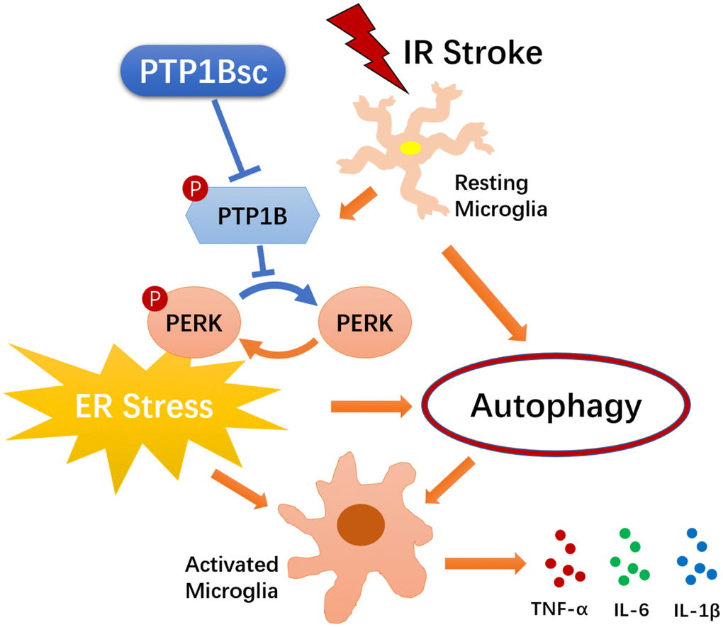 In summary, as illustrated in Figure 8, our study suggests that the PTP1B inhibitor, sc-222227, is able to reduce cerebral IR injury-induced deleterious microglial activation and subsequent neuroinflammation by modulating the ER stress-autophagy axis via PERK signaling in microglia. Intracerebroventricular administration of PTP1B inhibitor effectively protects against cerebral IR injury. These findings provide novel insight into the molecular association between PTP1B, ER stress-autophagy axis, microglial activation, and neuroinflammation, suggesting that PTP1B is an important factor in regulating microglia function. Moreover, our study sheds light on novel therapeutic strategies that target microglial PTP1B for cerebral ischemic stroke treatment.