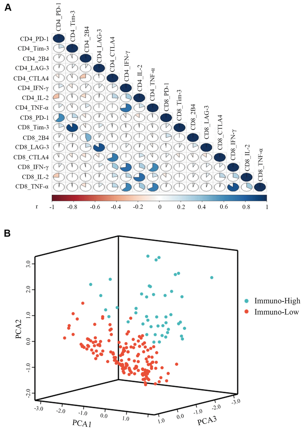 To compare the T cell immunity status of individual CHB patients, we used K-means cluster analysis. Before clustering, the correlation was tested among 16 immune markers for CD4+ and CD8+ T cells, including five pairs of co-inhibitory molecules and three pairs of antiviral cytokines. The data shows that 13 immune markers were independent of each other (r<0.8) and were then used to construct a T cell evaluation model (Figure 2A). Clustering was used to classify 229 patients into two groups of immuno-high or immuno-low. We found significantly greater levels of antiviral cytokines by CD4+ and CD8+ T cells—including IFN-γ, TNF-α, and IL-2—in the immuno-high group than in the immuno-low group (Supplementary Table 2). In contrast, we observed that the expression of exhausted T cell molecules—including PD-1 and 2B4—was higher in the immune-low group. These results suggest that the clustering model could help differentiate between high and low T cell immunity in CHB. The number of patients in the immuno-high group (47, 21%) was less than immuno-low group (182, 79%), indicating that most of the CHB patients’ comprehensive T cell immunity was low (Figure 2B).