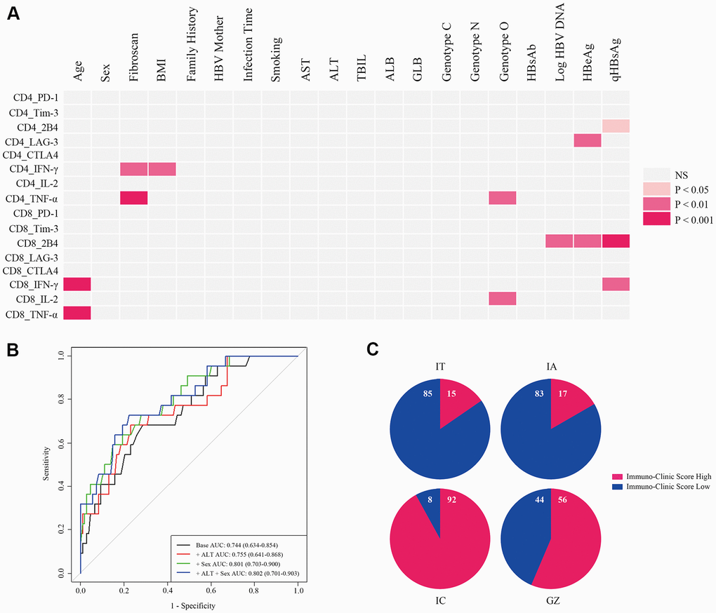 Sex affects the immune status, especially since the majority of CHB patients are male, and the main endpoint of CHB is also significantly related to sex. There may be two reasons for sex showing no obvious association with immune variables. One was our limited case number (n=229). Chen et al. found that males were associated with elevated baseline HBV DNA levels in a large study (n= 3653) [36]. The other reason is that the immune indicators were analyzed by sex separately, while the model investigated the effect of sex on the global immune status, which could be more informative to show that sex has an impact on immunity. Despite that sex did not show a significant correlation with immune markers, but it still contributed to the global T cell immune cluster, increased the AUC, and made the model more realistic. These results indicate that the ICS model could reflect the advantages of analysis in global T cell immunity.