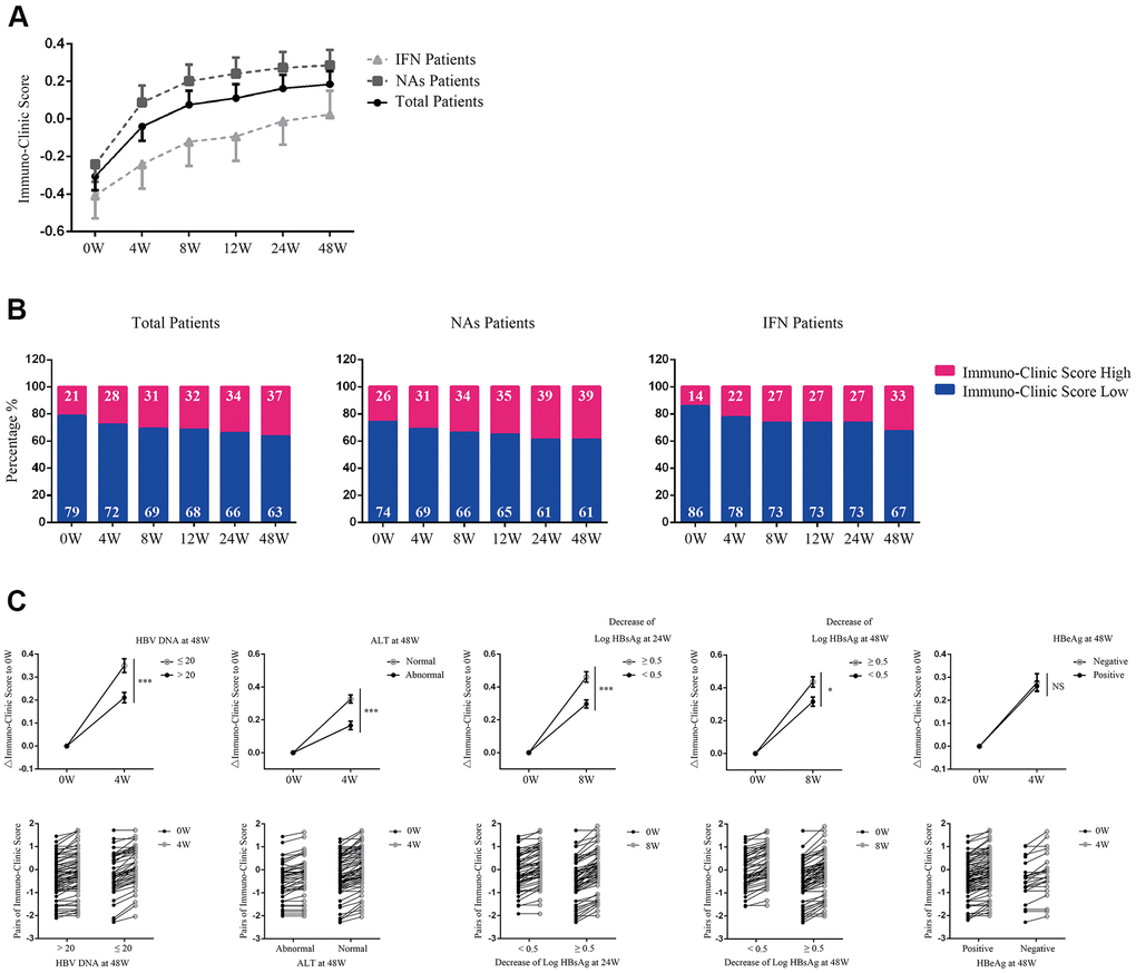 The strengths of this study include the following: (1) Our immune cluster evaluated T cell immunity by combining exhausting markers and antiviral cytokines, which could significantly improve its evaluation ability and integrity. (2) The ICS model was developed from immune clusters of large samples combined with readily available clinical-virological parameters. Our model also avoids the use of expensive and complicated immune tests. (3) ROC analysis indicated that the ICS model evaluation sensitivity was 72.7%, suggesting that most patients with high T cell immunity would be identified by the model. This proportion of patients may benefit from antiviral therapy or being placed under close observation. (4) Longitudinal analysis of antiviral therapy with the ICS model showed that the elevation of Immuno-Clinic scores as early as week 4 could predict the effectiveness of HBV DNA loss, ALT normalization, and HBsAg decline.