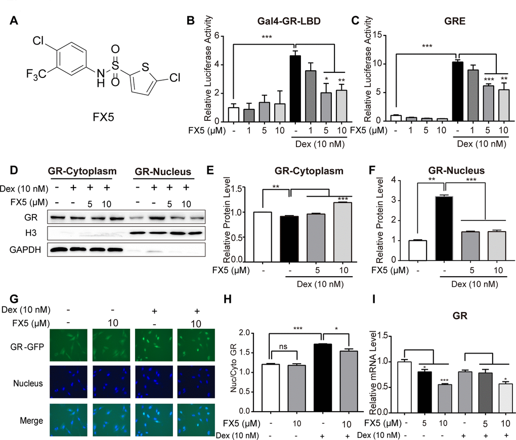 To find GR antagonists, we at first performed mammalian one-hybrid and transactivation assays against the lab in-house small compound library to screen out the active compounds able to antagonize GR, and FX5 (Figure 1A) was finally determined for its better inhibitory activity. As indicated in Figure 1B, 1C, FX5 effectively antagonized the Dex-induced activation of either reporter gene expression in mammalian one-hybrid assay or luciferase report gene expression in mammalian transactivation assay. These results thus demonstrated that FX5 displayed antagonistic activity against GR.