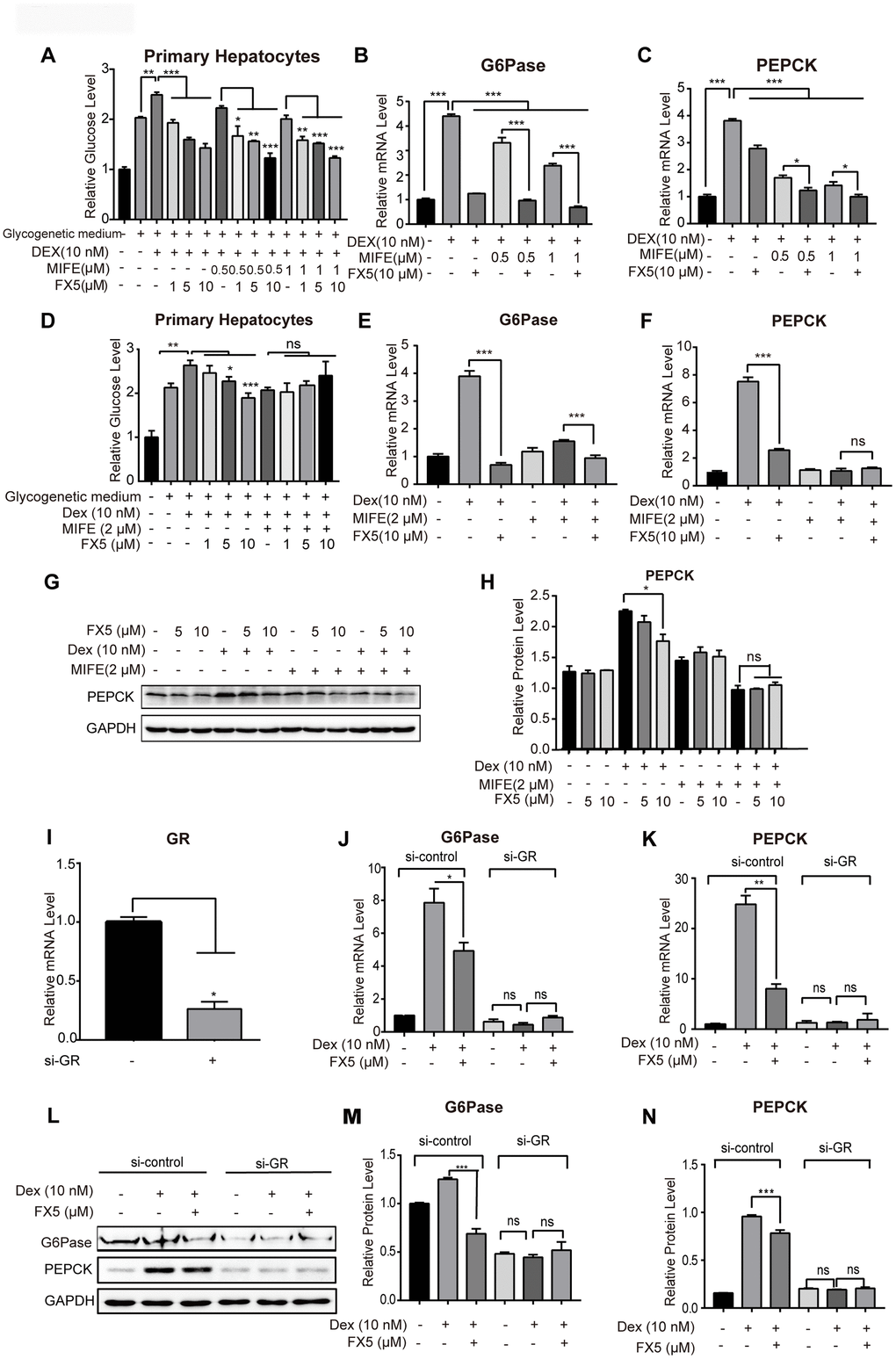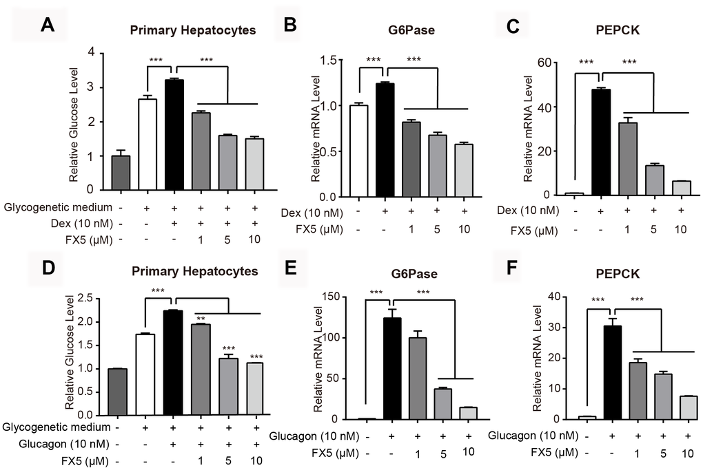 Since GR antagonist has an activity in inhibiting gluconeogenesis [35], we testified the potential of FX5 in suppressing glucose production and gluconeogenic gene expression in mouse primary hepatocytes.