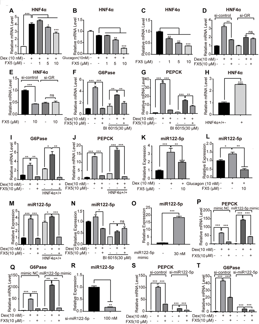 Given that miR122-5p is regulated by HNF4α and is involved in gluconeogenic regulation [26], we investigated the potential regulation of FX5 against miR122-5p in primary hepatocytes. As indicated in Figure 4K, 4L, FX5 antagonized Dex or glucagon-induced enhancement on miR122-5p expression. In addition, HNF4α overexpression plasmid and HNF4α inhibitor BI6015 were employed to examine whether FX5 suppressed miR122-5p depending on HNF4α. As shown in Figure 4M, 4N, FX5 suppressed the HNF4α overexpression-induced upregulation of miR122-5p, and BI6015 treatment deprived FX5 of its capability in antagonizing the Dex-induced miR-122-5p expression. These results thus implied that miR122-5p might function in the down-stream of GR/HNF4α signaling.