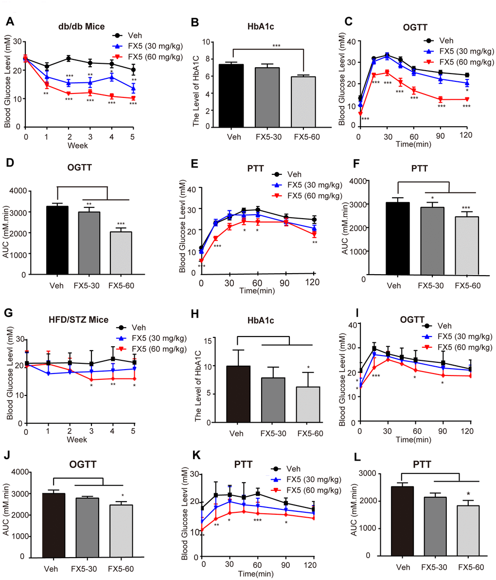 In the assay, db/db (n=10/group) and HFD/STZ (n≥7/group) induced T2DM mice were orally administrated with vehicle (Veh) or FX5 (30, 60 mg/kg) once per day for 5 weeks. During the period of administration, food intake and body weight were recorded, and blood glucose level after 6 h fasting was measured every week, while HbA1c level was detected after mice sacrifice.