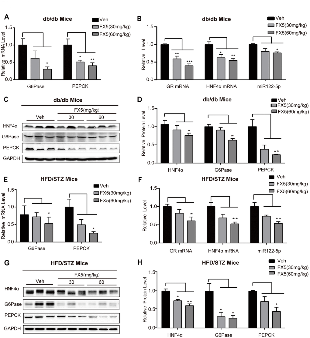 Given that FX5 reduced gluconeogenesis via GR/HNF4α/miR122-5p signaling pathway in primary hepatocytes, we verified such FX5-mediated regulation in the liver tissues of T2DM mice. Western blot (Figure 6C, 6D, Figure 6G, 6H) and quantitative RT-PCR (Figure 6B, 6F) results indicated that FX5 treatment suppressed protein level of HNF4α, mRNA levels of GR and HNF4α, as well as expression level of miR122-5p in db/db or HFD/STZ induced T2DM mice.