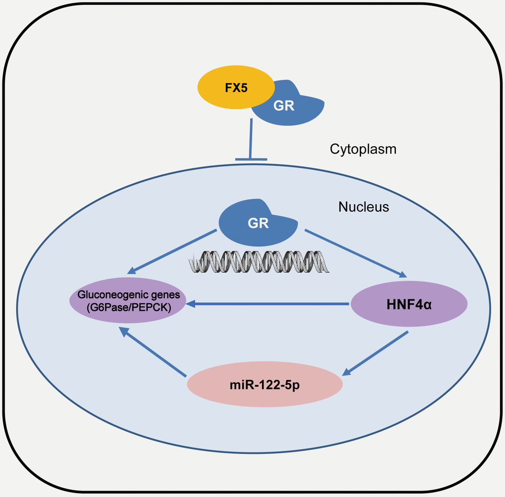In summary, we determined that small molecule FX5 efficiently improved hyperglycemia in T2DM mice. The underlying mechanism has been intensively investigated. As illustrated in Figure 7, FX5 alleviated gluconeogenesis either directly by antagonizing GR or indirectly through GR/HNF4α/miR-122-5p signaling pathway. Our work has presented a new mode for GR antagonist in the regulation of gluconeogenesis, which may help design new generation of GR modulators against T2DM and highlight the potential of FX5 in the treatment of this disease.