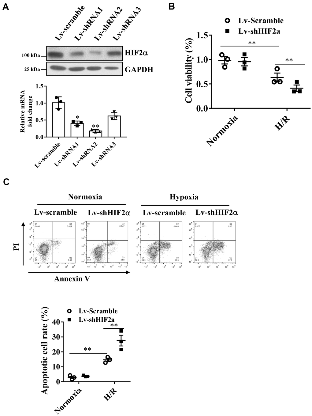 After knocking down the endogenous HIF2α gene, we subjected H9c2 cardiomyocytes to H/R treatment. Our results showed that the apoptotic rate of cardiomyocytes increased significantly after H/R. Moreover, after knockdown of the HIF2α gene in H9c2 cells, the proportion of apoptotic cells increased further (Figure 1C). In addition, we found that knocking down the endogenous HIF2α gene reduced cell survival after H/R (Figure 1B), suggesting that HIF2α confers cardioprotective effects on H9c2 cardiomyocytes during I/R.