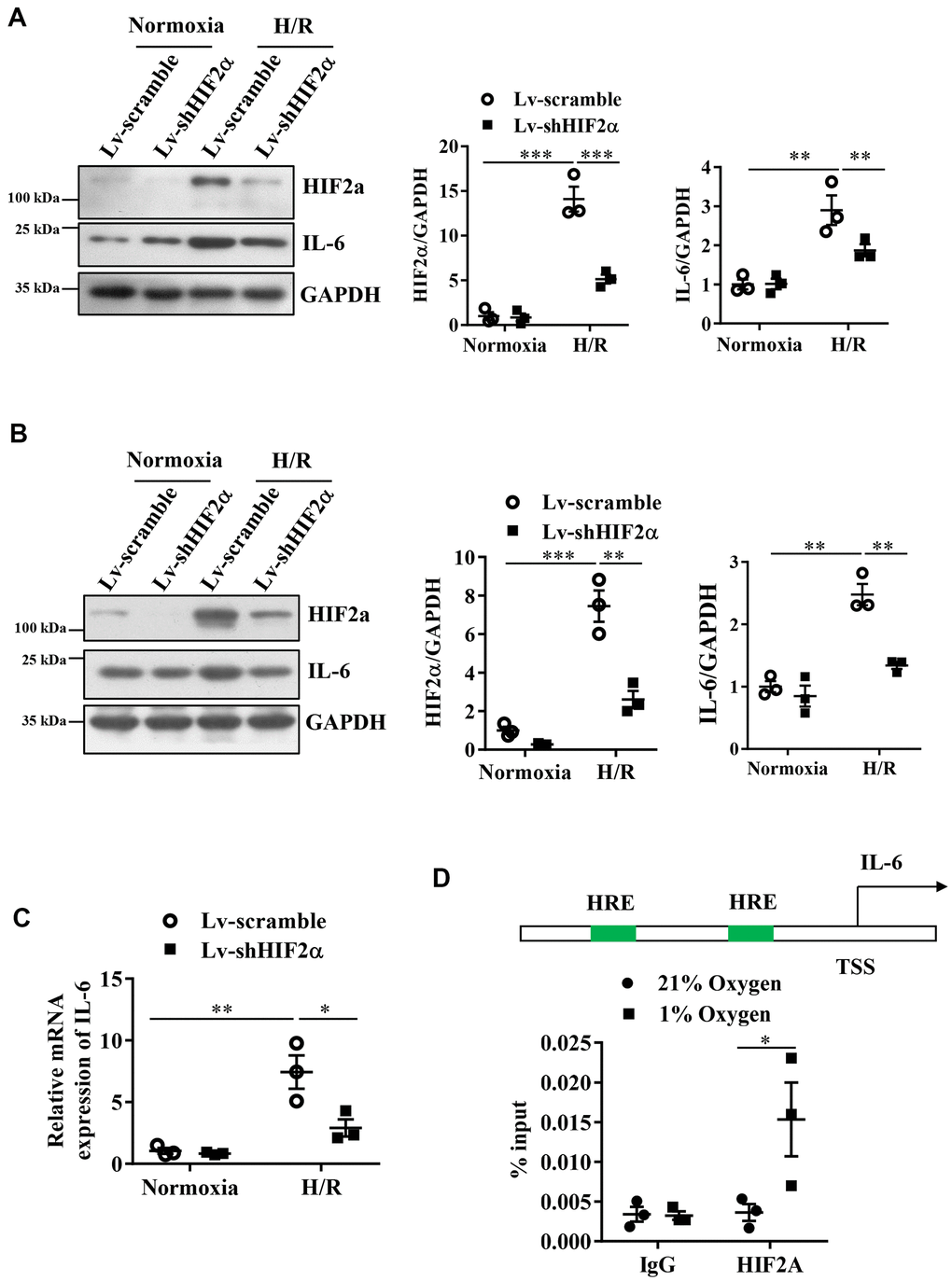 Our results showed that compared with the cells in a normoxic environment, those under H/R conditions expressed significantly increased levels of HIF2α and IL-6 proteins. This result suggests that H/R stimulates the expression of HIF2α and IL-6. After knockdown of endogenous HIF2α, the IL-6 protein level was also low in the mice (Figure 2A).