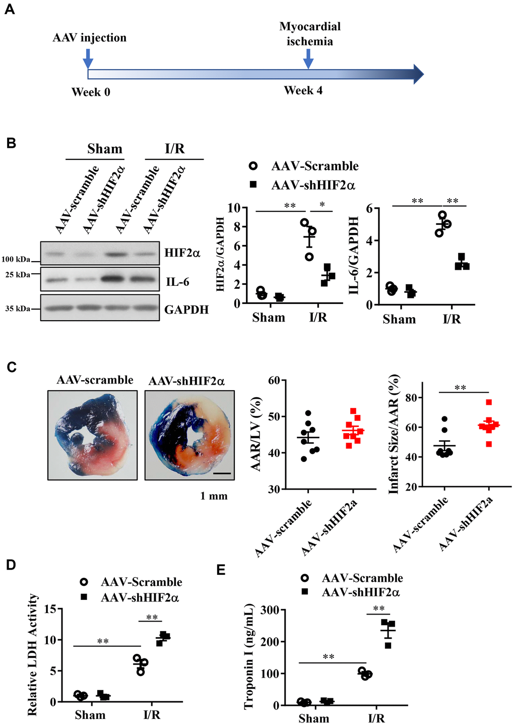 We prepared AAV9-shHIF2α, AAV9-shIL-6, and AAV9–mCherry vectors as described [40]. We injected 1 x 1012 vg of AAV9-mCherry, AAV9-shHIF2α or AAV9- shIL-6 intravenously into the tail veins of 4- to 5-week-old male C57 mice as described previously [41]. We conducted sham or myocardial ischemia operations 4 weeks after the AAV9 injections.