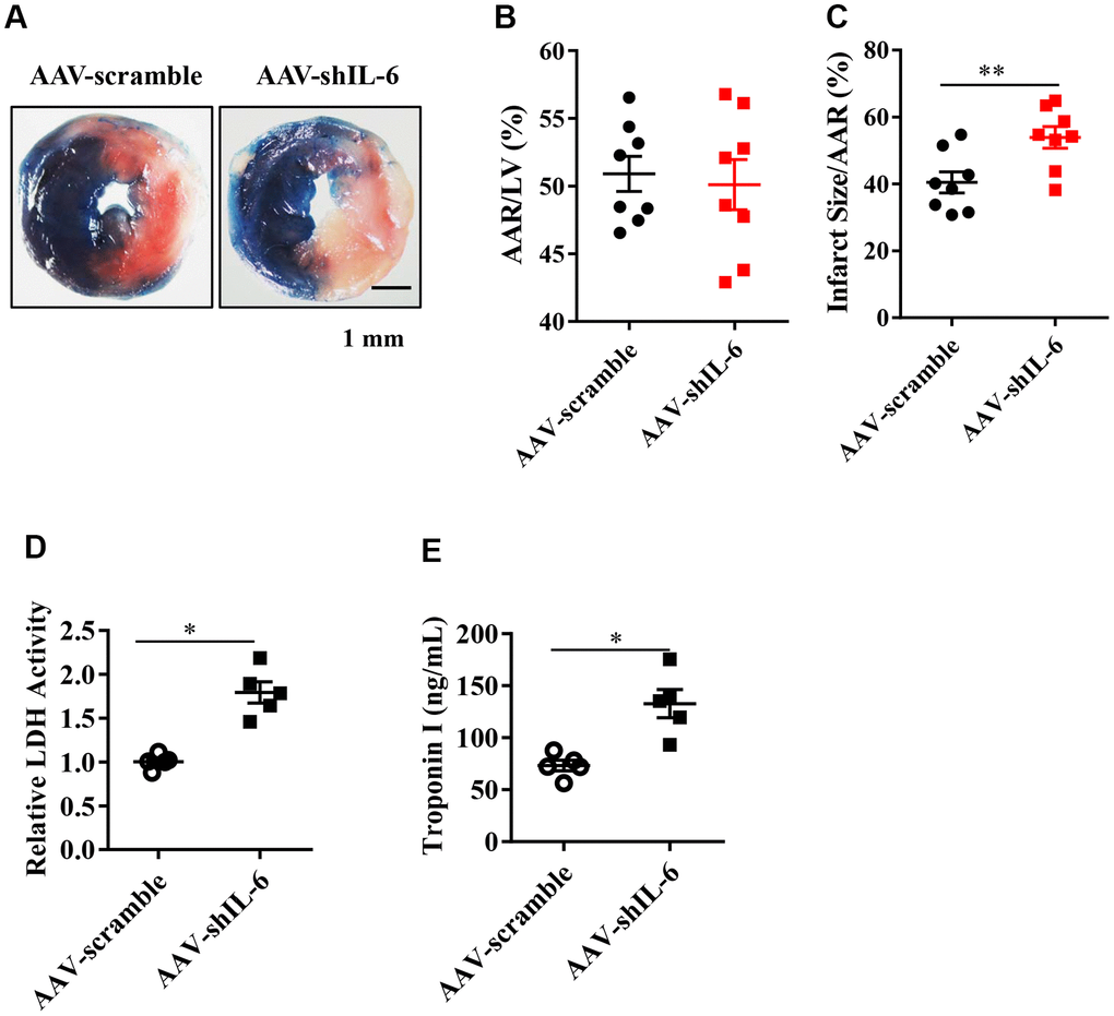Next, we sought to determine whether IL-6 is involved in the protective effects of HIF2α during myocardial I/R. First, we constructed a type 9 adeno-associated virus vector (AAV9-shIL-6) that specifically downregulates the IL-6 gene. Our results showed that both the mice in the AAV-scramble and AAV-shIL-6 groups had similar cardiac risk areas (Figure 4A, 4B). However, the mice in the AAV-shIL-6 group had larger myocardial infarction ranges than the mice in the AAV-scramble group (Figure 4A, 4C), with higher LDH and TnI values (Figure 4D, 4E). These findings indicate that in vivo knockdown of IL-6 increases the range of myocardial infarction in mice. That is, IL-6 knockdown in vivo exacerbates MIRI. Our observations confirmed that IL-6 is important for the protective effects of HIF2α during myocardial I/R.