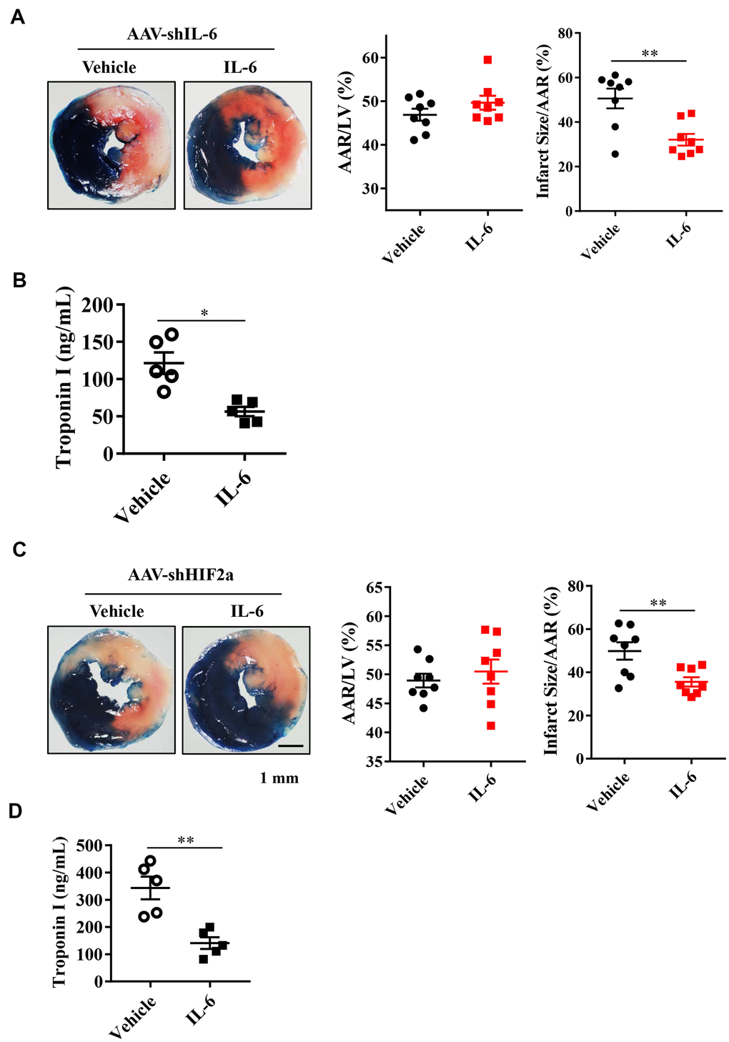 Next, we investigated whether treatment with recombinant IL-6 rescues mice with downregulated HIF2α. After knocking down the HIF2α gene, we treated mice with 10 μg/kg recombinant IL-6. The results of Evans blue staining showed similar cardiac risk areas after subsequent exposure to 30 min of ischemia and 24 h of reperfusion between the IL-6-treated and control mice (Figure 5C). However, the area of myocardial infarction and the level of troponin I were both significantly lower in the IL-6-treated mice than in the control mice (Figure 5C, 5D). Thus, recombinant IL-6 treatment is associated with attenuated MIRIs in the HIF2α-knockdown mice.