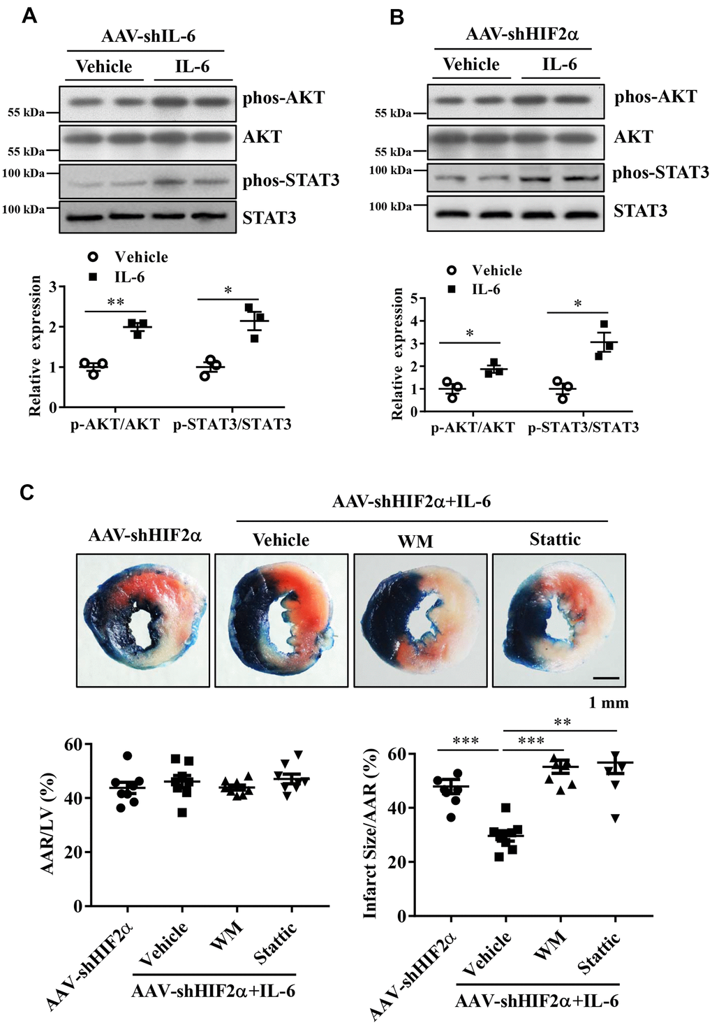 To determine the roles of PI3K/Akt activation and STAT3 activation in the cardioprotection of HIF2α /IL-6 against myocardial I/R, we administered the PI3K inhibitor wortmannin (1 mg/kg) and the STAT3 inhibitor Stattic (2 mg/kg) to the mice 60 min prior to ischemic insult. Our data indicate that blockade of PI3K/Akt as well as the STAT3 pathway abolished the HIF2α/IL-6-induced cardioprotective effects (Figure 6C). These findings suggest that HIF2α/IL-6 is dependent on PI3K/Akt activation and STAT3 activation to mediate its effects.