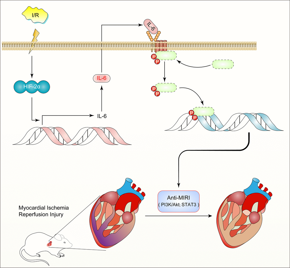 In the present study, we address the functional roles of HIF2α in mediating cardioprotective responses through the induction of IL-6. In addition, our study showed that treatment with recombinant IL-6 reduced myocardial injury following MI/R and rescued the HIF2α-knockdown mice. Notably, our further investigation indicates that HIF2α/IL-6 confer cardioprotection through activation of the cardioprotective pathway, e.g., survival kinases such as Akt and STAT3.