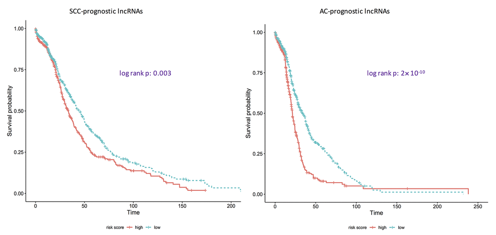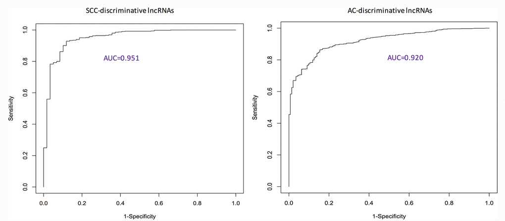 Using ROC curves (Figure 1), the discriminative ability of identified pan-SCC and pan-AC lncRNA signatures was evaluated. The AUCs of these two signatures are 0.951 and 0.920 for the SCC type and the AC type, respectively. Overall, these two signatures perform well. According to the log-rank tests (Figure 2), the identified pan-SCC and pan-AC prognostic lncRNA signatures have good prognostic values as well.