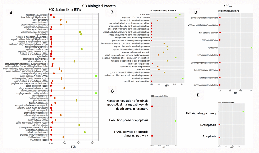 Using String software, pathway enrichment analysis was conducted. The results showed that no pathway or GO biological process term was enriched by the AC prognostic signature. Enriched pathways/GO biological process terms for the SCC and AC discriminative signatures and the SCC prognostic signatures are given in Figure 3. As far as the enriched KEGG pathways are considered, there is one overlap – necroptosis between the AC discriminative category and the SCC prognostic category. Necroptosis is a programmed caspase-independent cell death. Studies have shown that tumor undertakes necroptosis in vivo and the process has pro- or anti- tumor effects in cancer development and progression [116]. At the level of pathways, both SCCs and ACs may share some common features.