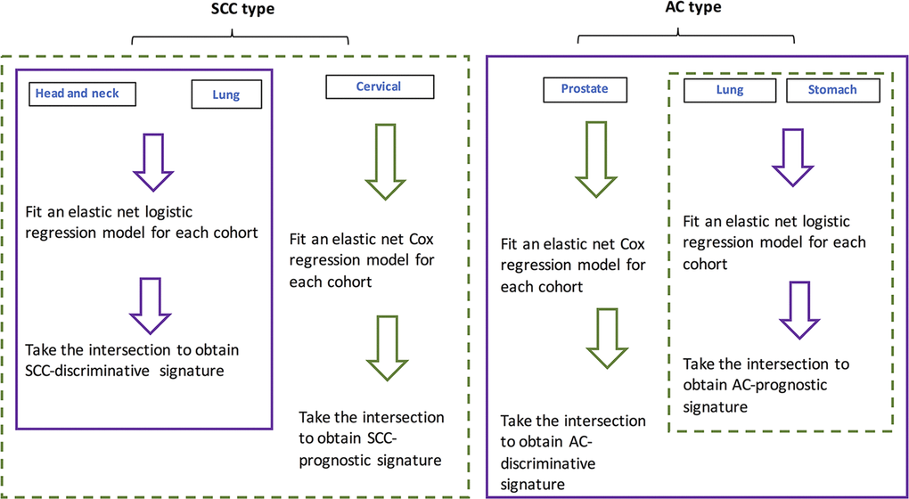 In this study, pan lncRNA signatures commonly applicable to SCCs or ACs with different tissues of origin were constructed with the aid of elastic-net regularized regression models. Specifically, an extensive investigation of potential discriminative and prognostic gene signatures was sought in TCGA, where both pieces of information are available. While a gene signature that can distinguish normal controls from tumors may provide insightful clues on initiation and development of the disease, a prognostic gene signature focuses more on the prediction of disease progression, thus facilitating more effective interventions for patients with poor prognosis to prolong their survival or cure the disease. Therefore, both types of signatures are of crucial importance.