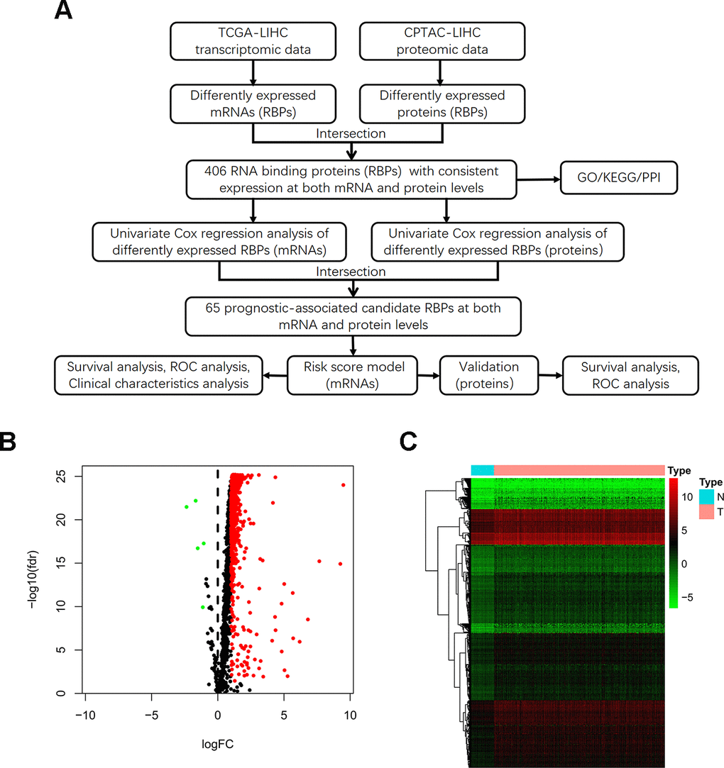 Although RBPs are known to be closely associated with the initiation and progression of various cancers, the comprehensive roles of RBPs in HCC remains unclear. The application of next-generation sequencing technology and modern protein mass spectrometry helps facilitate identification of changes in RBPs expression across HCC samples. In this study, we downloaded RNA-sequencing data from the Cancer Genome Atlas (TCGA) database and mass-spectrometry-based data from the Clinical Proteomic Tumor Analysis Consortium (CPTAC) database. After distinguishing consistently transcriptomic and proteomic alterations of RBPs between HCC tumor and normal tissues, we established a risk score model based on 11 prognostic RBPs. Ultimately, we identified a number of RBPs associated with the pathogenesis of HCC, which can be used as potentially prognostic biomarkers and drug targets of HCC patients in the future.