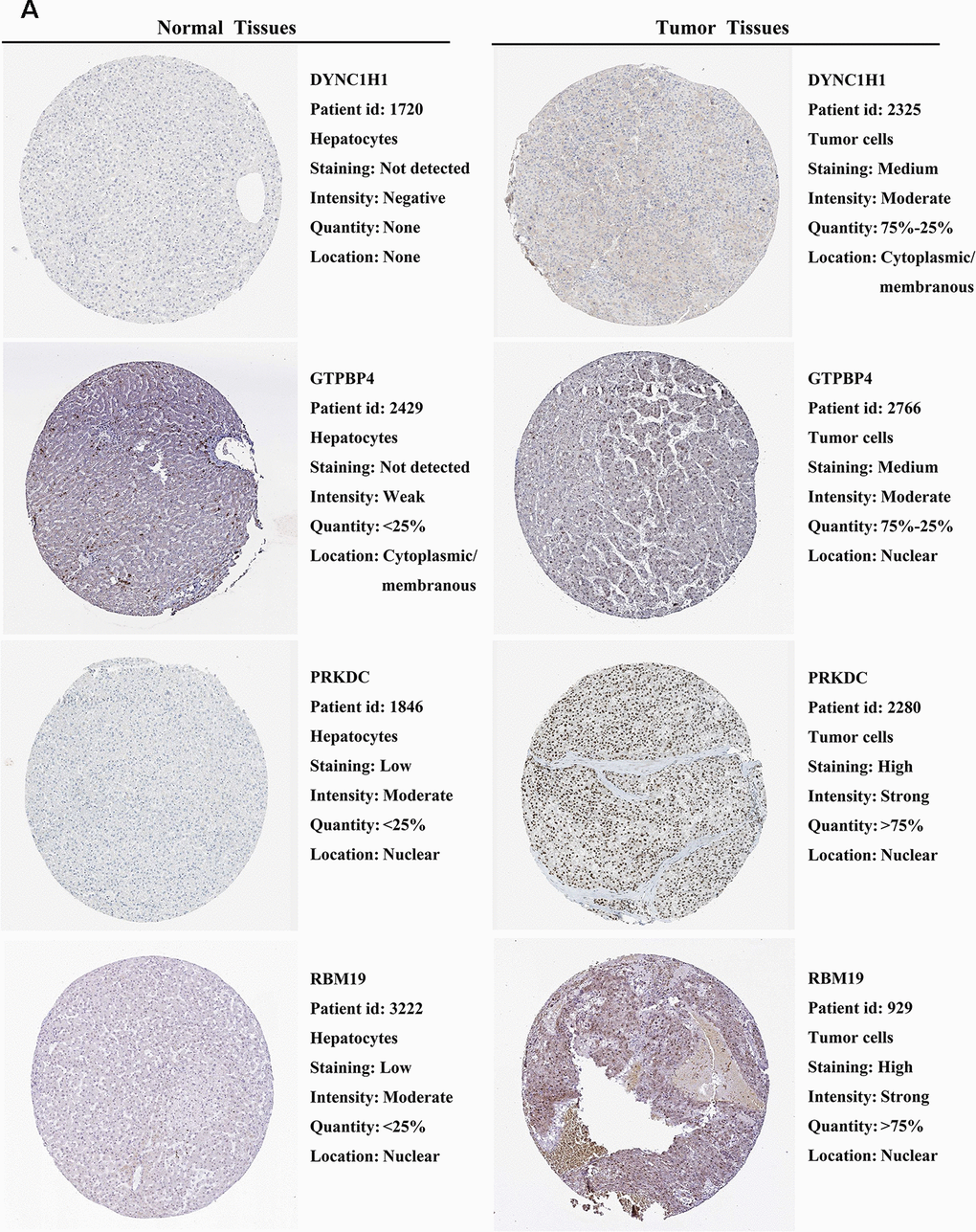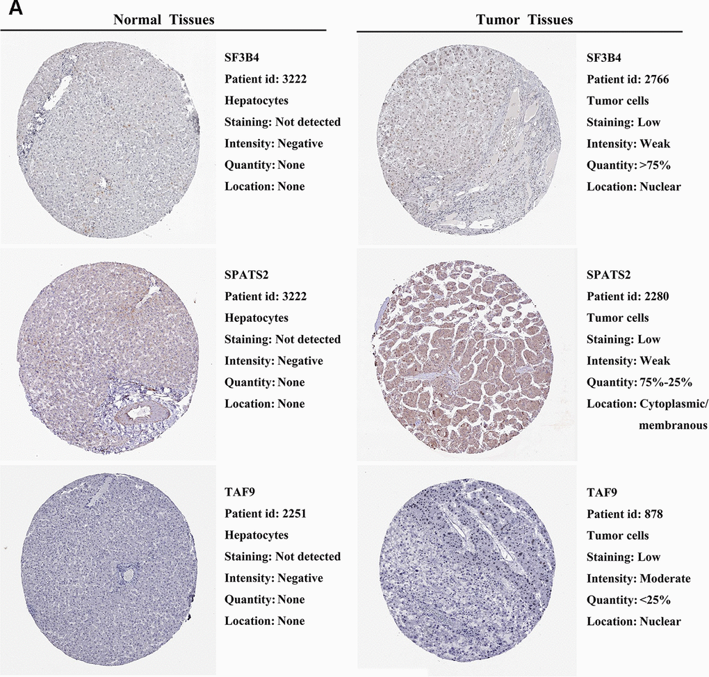 We further explored the expression of the 11 prognostic RBPs in the Human Protein Atlas (HPA) database. The immunohistochemistry (IHC) results demonstrated that DYNC1H1, GTPBP4, PRKDC, RBM19, SF3B4, SPATS2 and TAF9 were significantly increased in HCC tumor cells compared to normal hepatocytes (Figures 9, 10). However, IHC staining of BRIX1, RAN, SMG5 and THOC5 was missing and was pending further analysis.