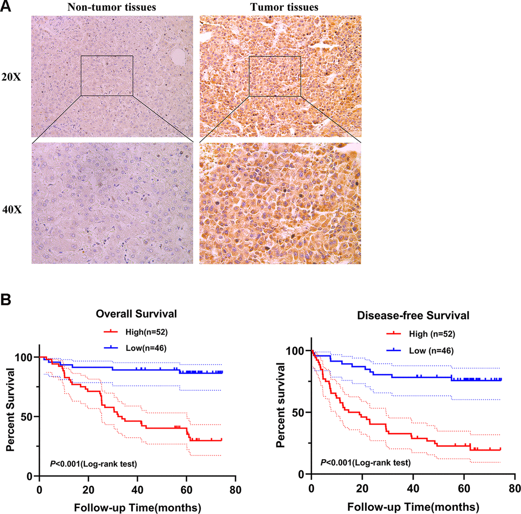 In total, 98 HCC patient tissues were collected from the Peking University Cancer Hospital and Institute. Clinical research was approved by the ethics committee of the Peking University Cancer Hospital and Institute. None of patients received any preoperative treatment. All tissues were histologically confirmed by pathologists. Immunohistochemistry staining was performed according to previously published protocols [69]. In brief, the staining index (0-12) was calculated by staining intensity (negative-0; weak-1; moderate-2; or strong-3) multiplying the percentage of SPATS2 positive staining (<5%-0; 5% ~ 25%-1; 25% ~ 50%-2; 50% ~ 75%-3;>75%-4). If the staining index of tumor tissues was greater than or equal to the median, then the expression of SPATS2 protein was identified as upregulated, and vice versa. The antibody used in this study was anti-SPATS2 (Bioss Inc, USA).