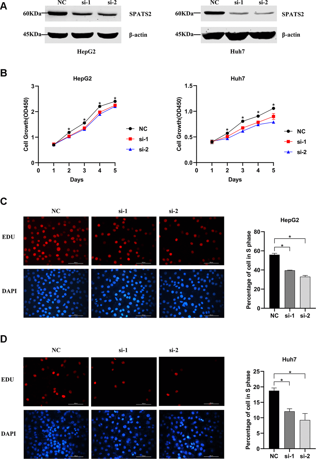 HepG2 and Huh7 cells were cultured in Dulbecco’s Modified Eagle Medium (DMEM) with 10% fetal bovine serum and incubated in a humidified chamber in 5% CO2 at 37° C. Two synthesized siRNAs were transfected into cells with Lipofectamine 2000™ (Invitrogen) according to manufacturer’s instructions. Knockdown efficiency for SPATS2 in HCC cells was confirmed by western blot.
