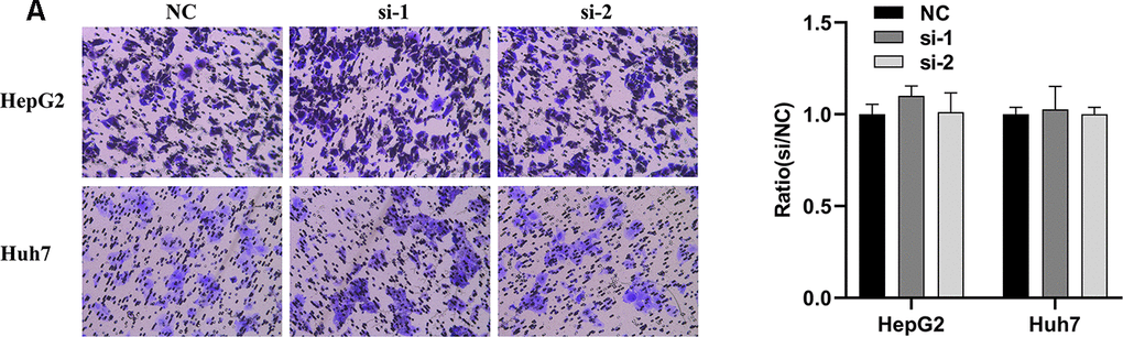 In order to explore whether SPATS2 has an effect on the function of HCC cells, we transiently transfected siRNAs into HepG2 cells and Huh7 cells (Figure 12A). According to results of the CCK8 assay, knockdown of SPATS2 inhibited cell growth compared to the negative control (Figure 12B, p < 0.05). Consistently, EdU cell proliferation assay indicated that SPATS2 depletion led to a significant reduction of S phase cells (Figure 12C, 12D, p < 0.05). However, there were no significant changes in the migration assay between the negative control and siRNAs (Figure 13A, p > 0.05). In conclusion, our results proved that SPATS2 depletion inhibited proliferation of HCC cells.