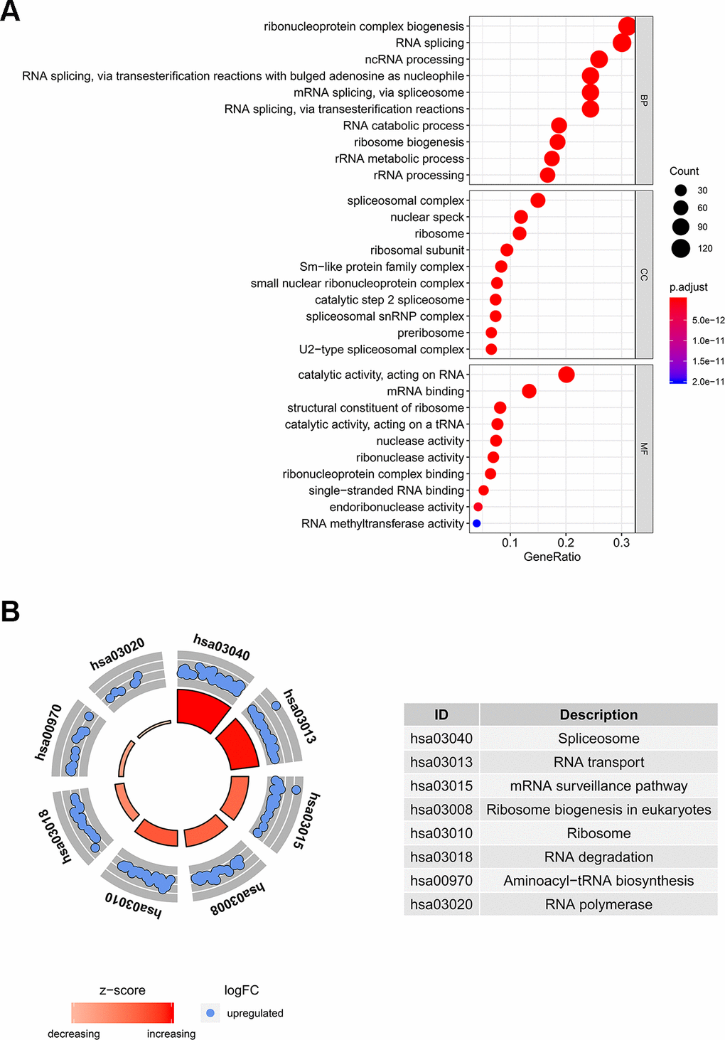 In order to determine the function and mechanisms of these 406 RBPs, we conducted GO enrichment and KEGG pathway analysis. GO enrichment analysis classified RBPs into three functional groups including biological process (BP), cellular component (CC), and molecular function (MF). The top 10 significantly enriched BPs, CCs and MFs are shown in Figure 2A. We found that the 406 differently expressed RBPs were mainly associated with RNA splicing, ribosome biogenesis and RNA binding. Additionally, KEGG pathway analysis indicated that the top 8 significantly enriched pathways included “Spliceosome”, “RNA transport”, “mRNA surveillance pathway”, “Ribosome biogenesis in eukaryotes”, “RNA degradation”, “Aminoacyl−tRNA biosynthesis” and “RNA polymerase” (Figure 2B). These pathways are closely correlated to RNAs maturation, transport, stability and translation. In conclusion, function and pathway enrichment analyses of differently expressed RBPs reflect changes that occur in post-transcriptional gene regulation (PTGR) between tumor and normal tissues.