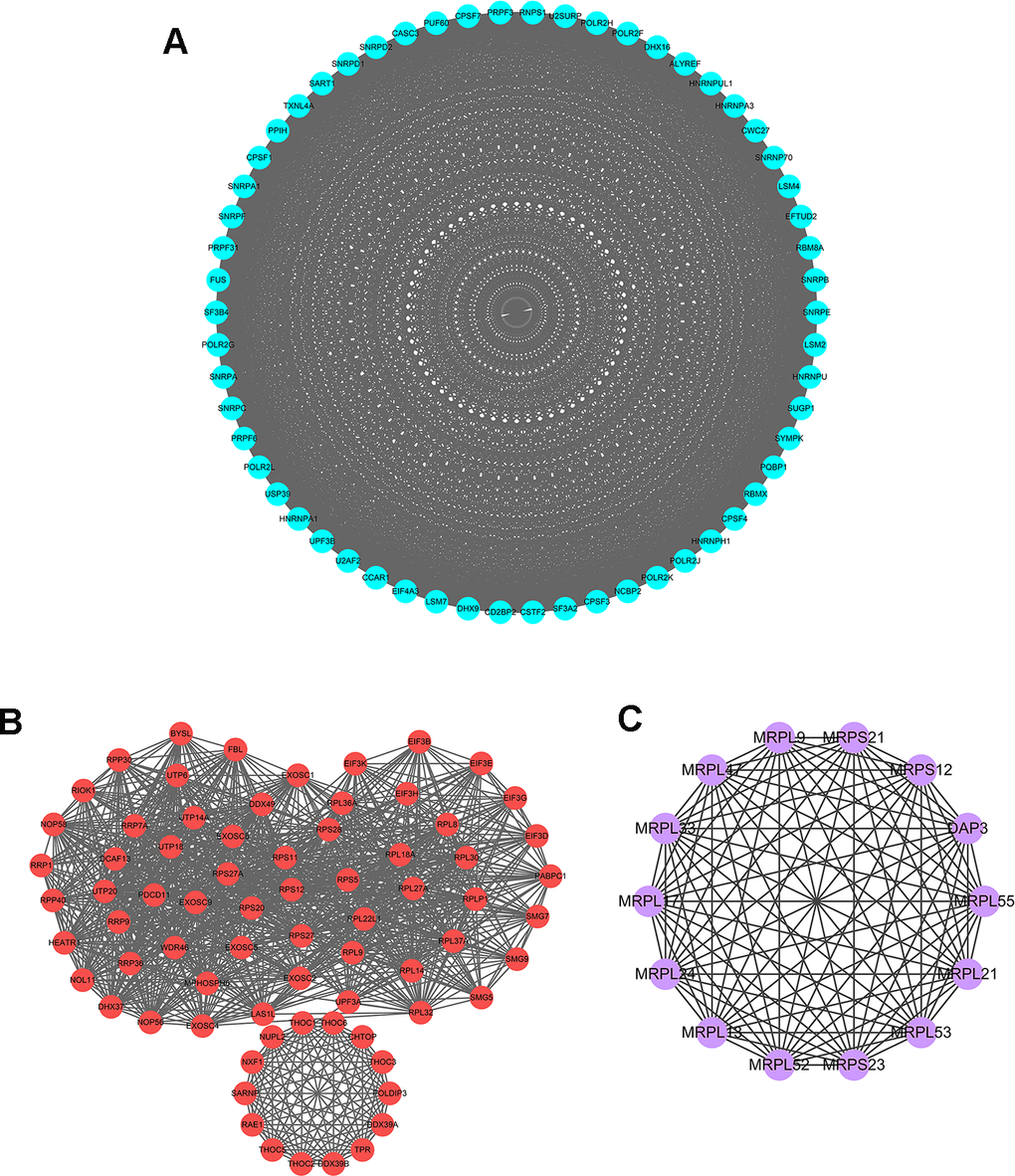 To further explore the functional protein association networks of differently expressed RBPs in HCC, we submitted the 406 RBPs to the STRING database. We obtained 312 nodes, 4457 edges, and a p-value of PPI concentration <1.0e–16 after setting filter conditions. The top three significant clusters within the PPI network were selected using the Cytoscape software with MCODE plug-in (Figure 3). We also analyzed the function of each module. Pathway enrichment analyses indicated that Module 1 was mainly associated with spliceosome, mRNA surveillance pathway and RNA polymerase (Supplementary Table 1). Module 2 was mainly involved in Ribosome, RNA transport and ribosome biogenesis in eukaryotes, while Module 3 was only related to ribosome pathway (Supplementary Tables 2, 3). The PPI network revealed that RBPs played a vital role in human RNA metabolism, which caused HCC progression.