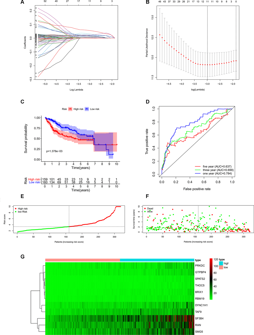 Using the “survival” package in R and Univariate Cox regression analysis, we confirmed relevant prognostic signatures from differentially expressed RBPs. P < 0.05 was considered statistically significant. In total, 11 gene signatures were selected by Lasso Cox regression analysis using the “glmnet” package. Next, we calculated a risk score to assess patient prognoses. The risk score formula for each sample was calculated according to RBPs expression (Expi) and coefficient value (βi): risk score= exp (0.048* BRIX1+ 0.014* DYNC1H1+ 0.017* GTPBP4+ 0.002* PRKDC+ 0.00001* RAN+ 0.022* RBM19+ 0.001* SF3B4+ 0.006* SMG5+ 0.027* SPATS2+ 0.011*TAF9+ 0.023* THOC5). HCC patients were divided into low-risk group and high-risk group based on the median of risk score values. Then, we used the “survival” package to compare differences of OS between the two groups. Additionally, a receiver operating characteristic (ROC) curve analysis was implemented using the “survivalROC” package to evaluate the prognostic capability of this model.