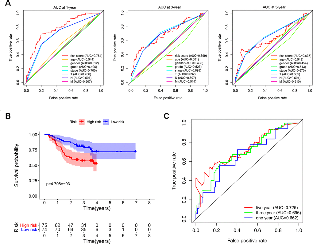 Next, we used LIHC patients with reliable prognostic information from the CPTAC database as a validation cohort to confirm the predictive ability of this prognostic model. We calculated the risk scores of each patient based on expression of the previously identified 11 RBPs and regression coefficients for the OS model. Similarly, we subdivided CPTAC-LIHC patients into high-risk group and low-risk group by the median of risk score values. There was a significant difference between the high-risk and the low-risk groups (p < 0.05) (Figure 6B). The ROC curve analysis validated that the AUC values for the OS model at 1 years, 3 years and 5 years were 0.662, 0.696 and 0.725, respectively (Figure 6C). These results demonstrated that the risk score model accurately predicted prognosis of CPTAC-LIHC patients in long-term follow-up.