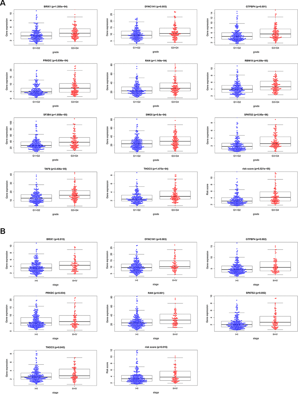 We analyzed the relevance between the 11 prognostic RBPs and clinicopathological features, such as tumor grade and TNM stage, in order to explore the differentially diagnostic capability of the prognostic signature. All 11 RBPs (BRIX1, DYNC1H1, GTPBP4, PRKDC, RAN, RBM19, SF3B4, SMG5, SPATS2, TAF9, and THOC5) were found to be significantly higher in patients with advanced tumor grade (p < 0.05). Only seven RBPs (BRIX1, DYNC1H1, GTPBP4, PRKDC, RAN, SPATS2, THOC5) expressed at higher levels in patients with advanced TNM stage (p < 0.05) (Figure 7). However, the risk score model was related to both tumor grade and TNM stage.