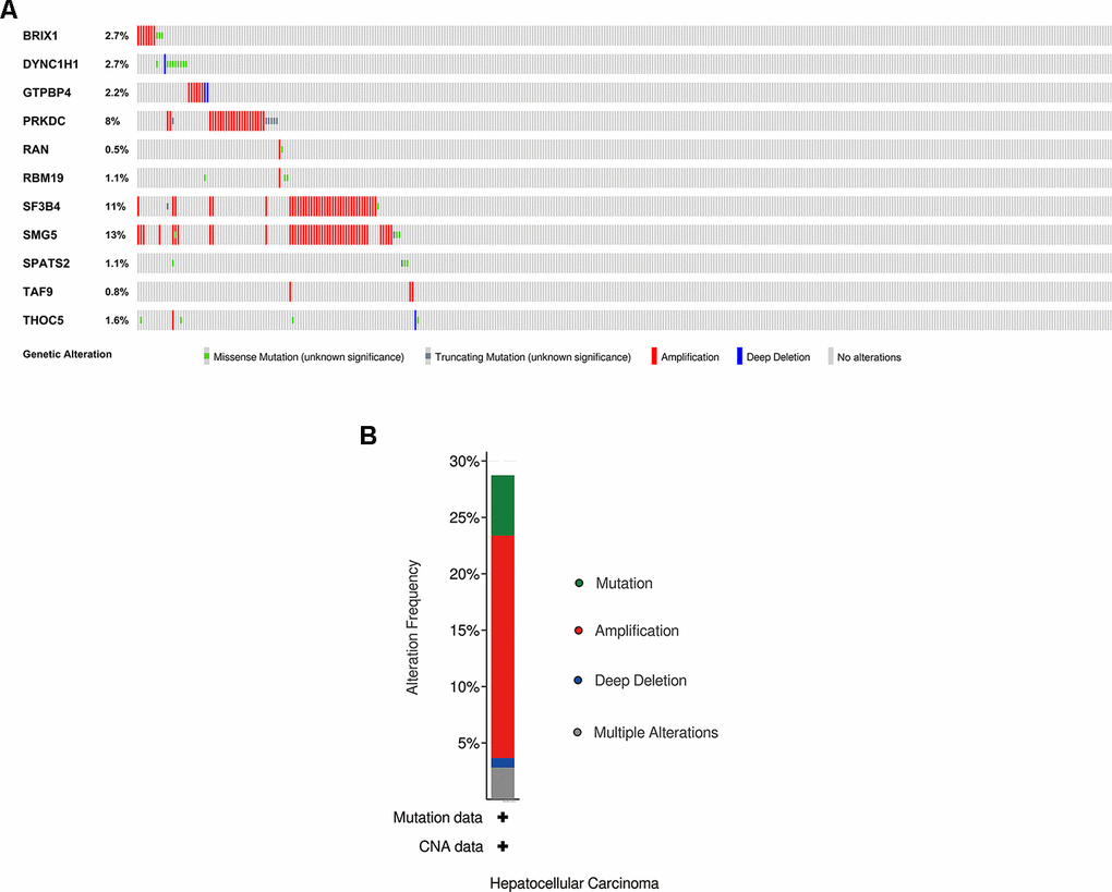 On the other hand, each RBP in the prognostic signature was evaluated for its relationship with clinicopathological features. All 11 RBPs (BRIX1, DYNC1H1, GTPBP4, PRKDC, RAN, RBM19, SF3B4, SMG5, SPATS2, TAF9, and THOC5) were expressed at significantly higher levels in patients with advanced tumor grade. Only seven RBPs (BRIX1, DYNC1H1, GTPBP4, PRKDC, RAN, SPATS2, THOC5) were expressed higher in patients at advanced TNM stage. We conducted in-depth exploration of altered genetic information for the 11 prognostic RBPs, including missense mutation, truncating mutation, amplification and deep deletion. Taken together, these were abnormally expressed in every gene. PRKDC, SF3B4 and SMG5 ranked top three with high amplification ratio. Among these RBPs, the known drug targets were PRKDC and RAN. It has been reported that oncogenic RBPs such as GTPBP4, PRKDC, RAN, SF3B4, SMG5, SPATS2, TAF9, and THOC5 promoted HCC cell proliferation, apoptosis, migration and invasion, which led to tumorigenesis and poor overall survival. These findings may contribute to the development of novel biomarkers for treatment and prognosis of HCC patients.