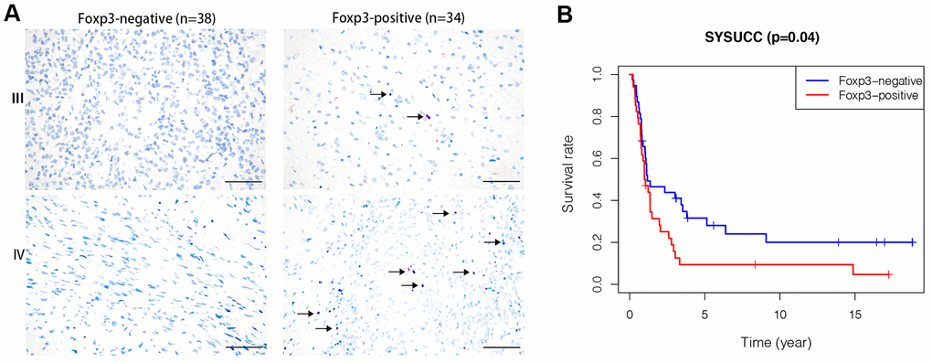 Clinicopathological details of patients in the prognosis cohort and their association with Foxp3 expression are summarized in Supplementary Table 1. IHC staining for Foxp3 was positive in 34 (47.2%) patients and negative in 38 (52.8%) patients. Foxp3 expression was very different in high-grade glioma tissues (Figure 1A). In the survival analysis, Foxp3 positivity was significantly associated with poor OS (p=0.04) (Figure 1B).