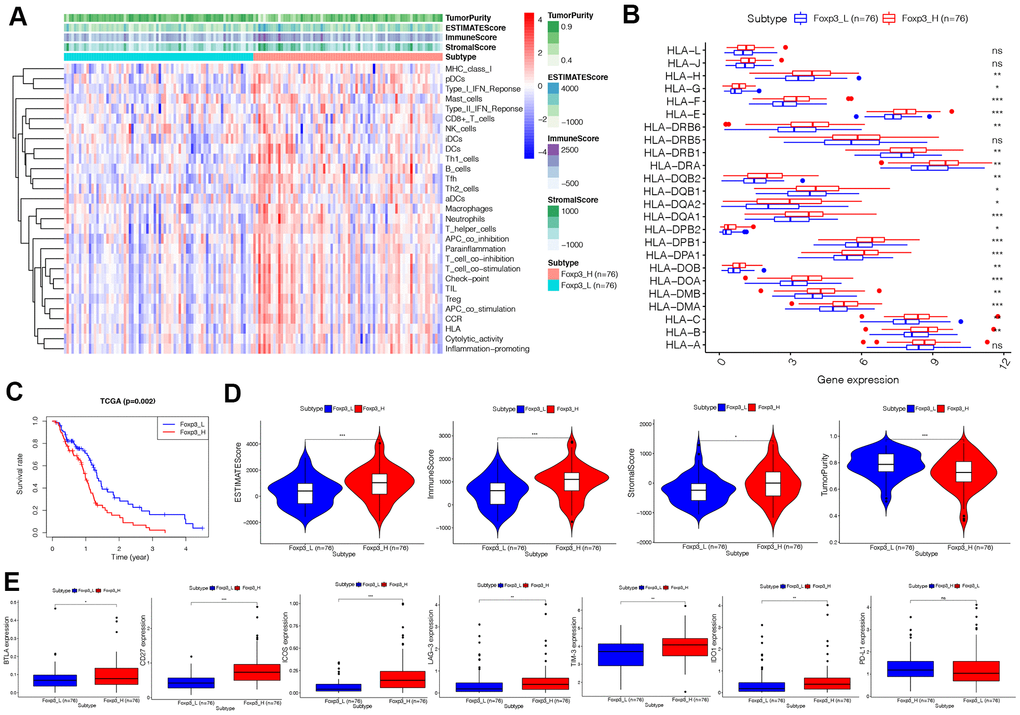 Survival analyses showed that clinical outcomes were distinct between Foxp3_H and Foxp3_L (Figure 2C). The Foxp3_L had a better survival prognosis than the Foxp3_H (Log-Rank test, P=0.002). Additionally, we compared the immune score, stromal score, ESTIMATE score, and the tumor purity between Foxp3_H and Foxp3_L. We found that the immune scores (Kruskal–Wallis test, P < 0.001), ESTIMATE scores (Kruskal–Wallis test, P < 0.001), and stromal scores (Kruskal–Wallis test, P < 0.05) were higher in the Foxp3_H group whereas the tumor purity was higher in the Foxp3_L group (Kruskal–Wallis test, P < 0.001) (Figure 2D). Overall, these results indicated that Foxp3_H had more immune and stromal cells, while Foxp3_L had more tumor cells.