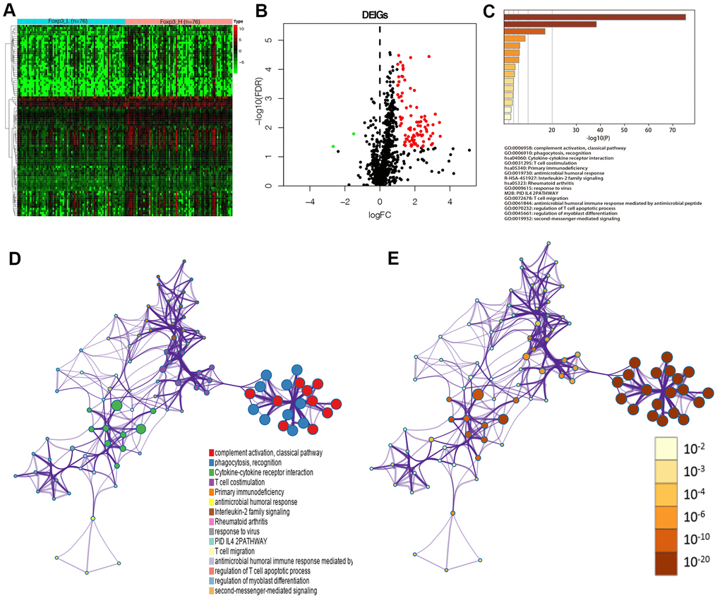 Differential expression analysis between Foxp3_H and Foxp3_L was processed and executed onRstudio using the Wilcoxon Rank Sum and Signed Rank Tests [44]. Genes with log2 |fold change| ≥1 and False Discovery Rate (FDR) <0.05 were selected as differentially expressed genes (DEGs). DEIGs were identified by the ImmPort database (https://www.immport.org/) [18].