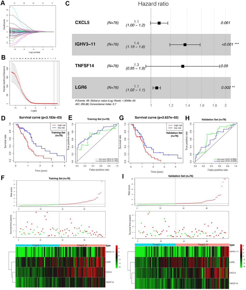 Four genes were identified as hub genes in our IPS by LASSO Cox regression: CXCL5, IGHV3-11, TNFSF14, and LGR6. CXCL5 (C-X-C motif chemokine ligand 5) encodes the protein CXCL5, a small cytokine belonging to the CXC chemokine family that is produced upon the stimulation of cells with the inflammatory cytokines IL-1 or TNF-α [26]. CXCL5 is not only known to regulate neutrophil homeostasis [27] but is also related to cancer cell migration/invasion and tumor angiogenesis [28]. In previous research, CXCL5 was shown to be up-regulated in glioma tissues compared with normal brain tissues and could promote the proliferation and migration of glioma cells by activating the ERK, JNK, p38, and MAPK signaling pathways [29]. In glioma cells, CD133, a cancer stem cell marker, raises the expression of IL-1β and its downstream chemokines, including CCL3, CXCL3, and CXCL5 [30]. Foxp3+Tregs could exert an immune function by controlling the CXCL5-IL-17 inflammatory axis [31]. And CXCL5 caused a 2.5-fold increase in the frequency of Foxp3+Tregs in CD4+T cells [32]. IGHV3-11 (immunoglobulin heavy variable 3-11) was one of the VH3 immunoglobulin gene family. The molecular function of IGHV3-11 is related to antigen binding and immunoglobulin receptor binding. Previous study had demonstrated that immunoglobulin could expand Foxp3+Tregs [33]. TNFSF14 (TNF superfamily member 14) encodes a member of the tumor necrosis factor (TNF) ligand family. This protein has been shown to induce the expansion of T cells and induce apoptosis of different tumor cells [34]. Treps et al. fused a CGKRK peptide with TNFSF14 and injected it intravenously into murine orthotopic GBM models. The tumor vasculature appeared to have normal features after treatment. Additionally, the authors observed more endothelial venules and T cell infiltration in solid tumors [35]. In a recent study, researchers determined that the expression of TNFSF14 negatively correlates with tumor mutation burden (TMB) in GBM and that TNFSF14 is a significant prognostic factor for poor OS [36]. TNFSF14 can promote the proliferation of Foxp3+Tregs [37], and bind HVEM which are expressed on Foxp3+Tregs to mediate the suppressive functions [38]. LGR6 (leucine-rich repeat containing G protein-coupled receptor 6) encodes a member of the leucine-rich repeat-containing subgroup of the G protein-coupled 7-transmembrane protein superfamily. LGR6 binds to RSPO ligands to activate the Wnt/β-catenin signaling pathway to promote cancer progression [39]. And Wnt/β-catenin signaling could modulate the TCF-1-dependent inhibition of Foxp3 transcriptional activity to limit immunosuppressive activity [40].