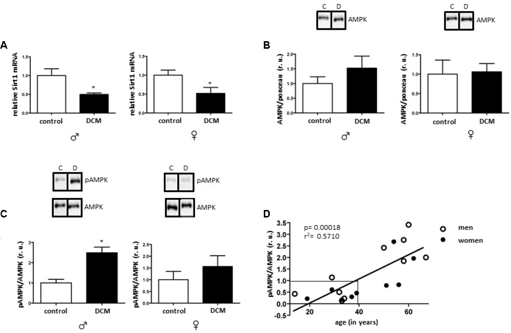 AMPK is a key Sirt1 partner in regulating metabolic activity and inflammation that is activated under metabolic stress [58]. AMPK and SIRT1 may regulate each other and share many common targets [15]. An increasing number of reports emphasize the supporting role of AMPK activity in cardiac metabolic homeostasis [59]. From the other side, persistent AMPK overactivation might be deleterious in some cases, with a chronic AMPK activation appearing to aggravate the pathological damage that strokes and myocardial ischemia cause [13, 60, 61], by, e.g., decreasing fatty acid oxidation [62]. Furthermore, sustained AMPK activation leads to excessive mitochondrial fragmentation and mitophagy, leading to the depletion of functional mitochondria [63]. Here, DCM in older patients was associated with increased phosphorylation of AMPK compared to the control group, whereas in young DCM patients AMPK phosphorylation was markedly reduced. Though diminished AMPK activity in hearts with DCM has been previously observed [61], no age dependence has been demonstrated. In fact, both we and others [13, 32] observed a marked reduction of the cardiac AMPK phosphorylation in older, control individuals. It is tempting to speculate that, with the reduced AMPK phosphorylation in older hearts, additional DCM-related metabolic impairment may trigger the compensatory activation of the AMPK phosphorylation. Fitting in with this view, decreased ATP levels are commonly observed in DCM patients [64].