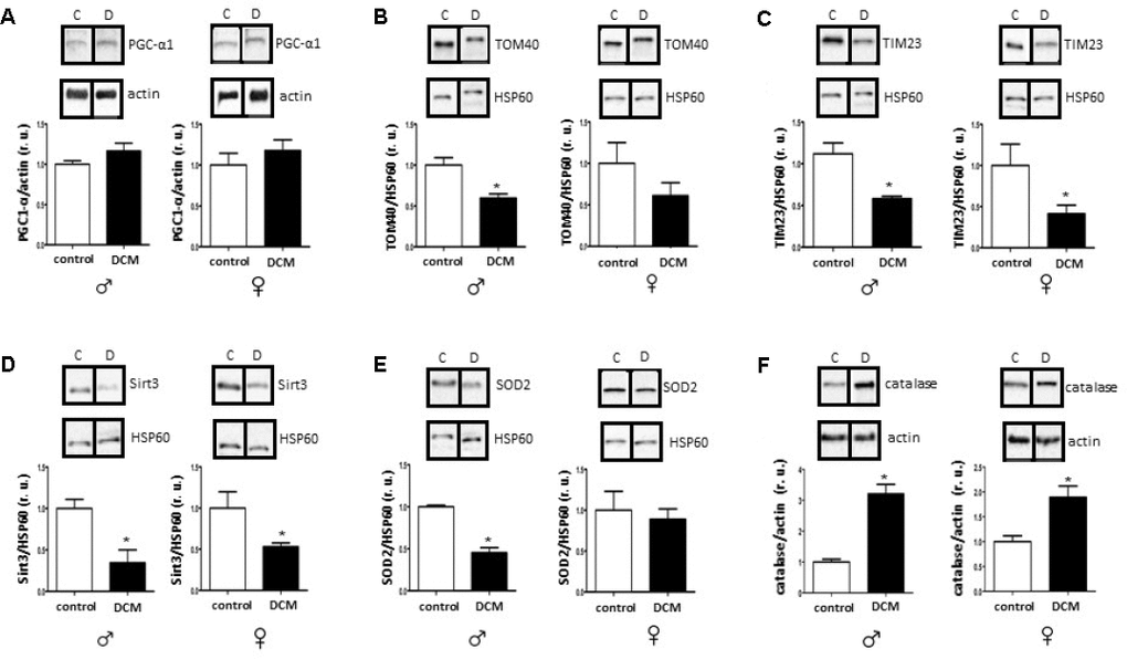 In conclusion, the present study revealed that DCM is associated with the downregulation of key metabolic regulator Sirt1, diminished mitochondrial biogenesis and anti-oxidative defense, and an increased inflammatory response in older DCM hearts in both sex-dependent and -independent manners.