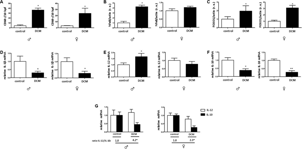 NFκB promotes inflammation in myocardial tissue in age-related diseases [76]. In accordance with this function, our results showed enhanced NFκB expression in DCM hearts in older males. [27, 77]. Pro-inflammatory mediators are increased in aging under certain physiological conditions [78]. In the present study, the expression of pro-inflammatory factor IL-12 was elevated in older DCM hearts only in males, while a substantial decrease in IL-10 expression was observed in older DCM hearts in a sex-independent manner. A reduced IL-10 expression is a typical fingerprint observed in cardiac aging [32] as well as in aging macrophages [79]; furthermore, IL-10 deficiency promotes a detrimental course of inflammation [80]. The total amount of cardiac macrophages was elevated in DCM patients in this study and accompanied by a shift in the IL-12/IL-10 ratio to IL-12 side, which is a marker of pro-inflammatory macrophages [81].