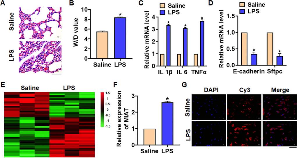 We first established mouse model of pneumonia by intraperitoneally injecting LPS, and the inflammation of lungs was evaluated. LPS treatment significantly increased the infiltration of inflammatory cell and induced the pulmonary edema (Figure 1A). LPS injection increased wet dry mass ratio (W/D) of isolated lungs, indicating that LPS treatment induced pulmonary edema (Figure 1B). Then qRT-PCR also indicated that the expression of inflammatory factors IL 1β, IL 6 and TNFα was upregulated upon LPS stimulation (Figure 1C). Alveolar epithelial cells are involved in maintaining normal lung function, so we estimated alveolar epithelial cells function by examining epithelial markers expression. LPS administration reduced the mRNA expressions of E-cadherin and Sftpc (Figure 1D). Above data proved that the mouse pneumonia model was established successfully. Then, we performed Microarray analysis, and the data showed the differentially expressed lncRNAs in saline and LPS treatment of lung tissues, which showed an increase of MIAT in LPS-treated lung tissues (Figure 1E). Then qRT-PCR also indicated that MIAT was upregulated in LPS-treated lung tissues comparing with saline-treated lung tissues (Figure 1F). Then, FISH assay showed that MIAT expression, predominantly located in the cytoplasm, was dramatically raised in lung tissue of LPS stimulation (Figure 1G).
