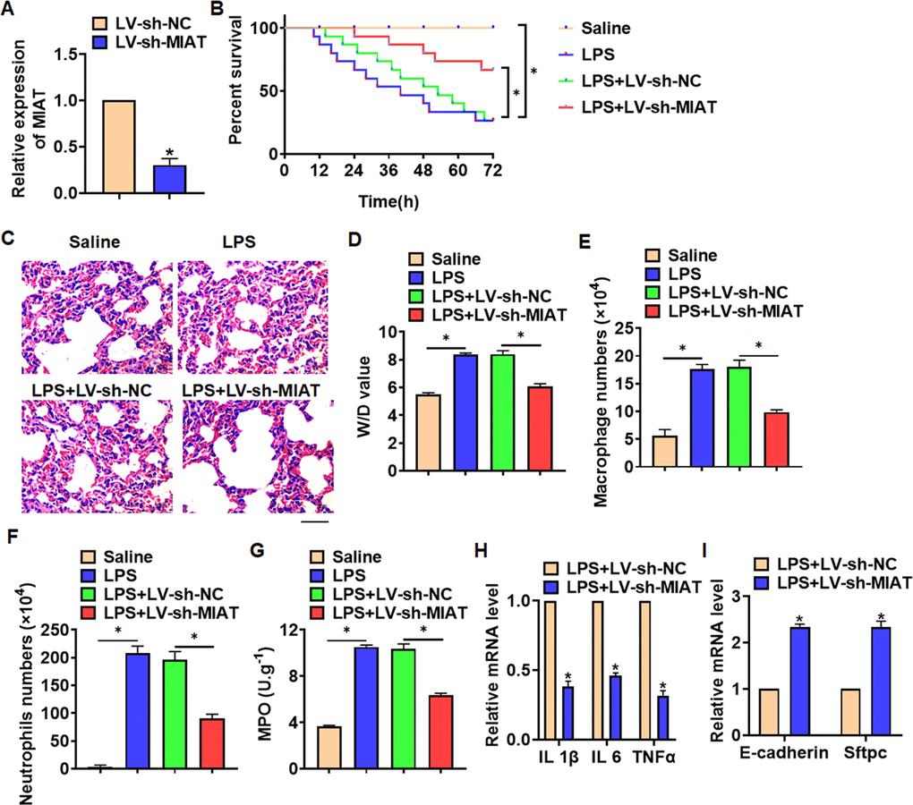 For further research, we constructed lentiviral plasmid for knockdown the expression of MIAT (LV-sh-MIAT, LV-sh-NC was indicated as a control group), and intratracheally injected into mice (Figure 2A). The survival curve showed that LPS significantly inhibited the survival rate of mice, while deletion of MIAT decreased the mice mortality compared with LPS group (Figure 2B). Histological examination showed that LPS caused structural damage of lung tissue in mice, accompanied by apparent inflammatory cell infiltration and alveolar hemorrhage. LV-sh-MIAT could significantly alleviate the above pathological changes induced by LPS (Figure 2C). LPS stimulation increased wet dry mass ratio (W/D) of isolated lungs, while LV-sh-MIAT injection decreased W/D, indicating that sh-MIAT inhibited pulmonary edema (Figure 2D). Then, we collected and calculated macrophages and neutrophils in alveolar lavage fluid LPS injection promoted the numbers of macrophages and neutrophils, while sh-MIAT inhibited the aggregation of macrophages and neutrophils (Figure 2E, 2F). As well, sh-MIAT inhibited the increase of myeloperoxidase (MPO) in LPS-treated lungs (Figure 2G). In addition, silencing of MIAT inhibited inflammatory factors expression (Figure 2H), and restored the level of E-cadherin and Sftpc comparing with LPS treatment group (Figure 2I).