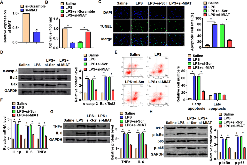 In vitro, we cultured TC-1 cells treated with LPS (100 ng/mL) to mimic in vivo LPS-induced pneumonia. And siRNA of MIAT was transfected into cells with LPS treatment (Figure 3A). MTT results showed that LPS treatment decreased cell viability, while si-MIAT recover cell viability and remitted the injury effects of LPS (Figure 3B). In addition, TUNEL analysis exhibited an increase of apoptotic cell numbers in LPS treated TC-1 cells, while si-MIAT decreased apoptotic cell numbers (Figure 3C). As well, LPS promoted the expression of cleaved-caspase-3 and Bax/Bcl2, which was reversed by si-MIAT transfection (Figure 3D). Flow cytometry assay showed that si-MIAT inhibited both early and late apoptotic cell numbers (Figure 3E). Moreover, LPS induced the expression of inflammation factors, while si-MIAT reduced inflammation factors level (Figure 3F, 3G). NF-κB signaling exerts an essential function in inflammation response. LPS treatment activated NF-κB signaling with increasing expression of p-IκBα and p-p65, but this effect was reversed by si-MIAT transfection (Figure 3H).
