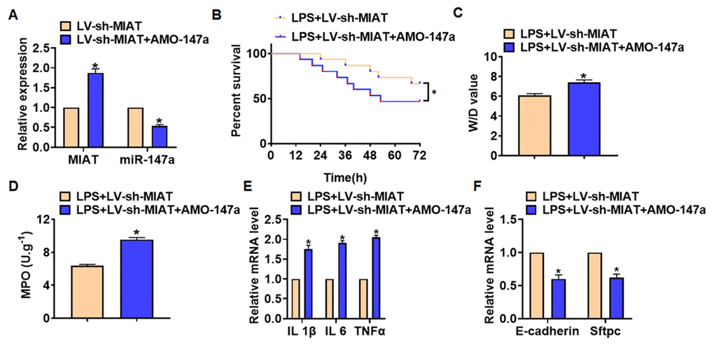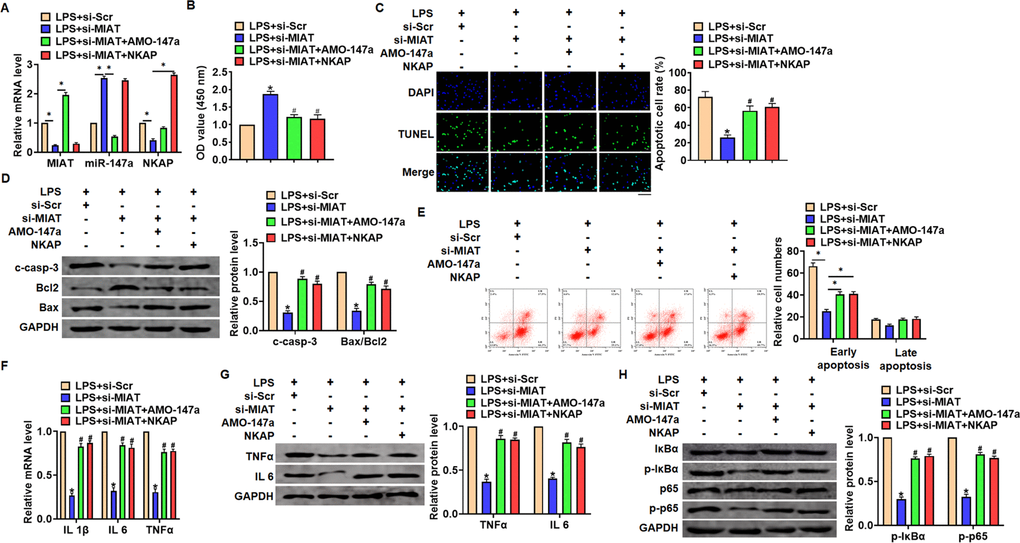 We then inhibited expression of MIAT with AMO-147a or NKAP in TC1 cells (Figure 6A). Knockdown of MIAT inhibited LPS-induced apoptosis, inflammation response and NF-κB signaling activation (Figure 6B–6G). However, AMO-147a or NKAP removed the beneficial role of si-MIAT on TC-1 cells (Figure 6B–6H). Moreover, LV-sh-MIAT was intratracheally injected into mice with or without AMO-147a, and the expression of MIAT and miR-147a in lung tissues was detected using qRT-PCR (Figure 7A). Followed functional experiments showed that AMO-147a reversed the protected effects of sh-MIAT in LPS-treated lungs (Figure 7B–7F).