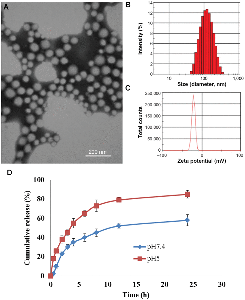 Transmission electron microscopy (TEM) and dynamic light scattering (DLS) were used to detect the morphological characteristics and particle size parameters of drug-loaded nanoparticles. The nanoparticle solution was diluted with deionized water. Then we dropped 10 μL of sample onto a carbon-coated copper mesh, dried overnight at room temperature, and volatilized excess water. The sample then was re-dyed with 5 μL of 1% uranyl acetate solution for 30 seconds, and filter paper was used to suck the dyeing solution, the sample was dried at 42° C with a constant temperature dryer. The morphology of the sample was observed with a transmission electron microscope (Tecnai G2 20 STWIN). Different nano micelle solutions were diluted to 0.25 mg/mL with deionized water, and 1mL sample was taken to measure the hydration diameter and Zeta potential of nano particles with a laser particle sizer (Zetasizer 5000) [28]. Determination conditions: laser wavelength 633nm, angle 90, temperature 25° C.
