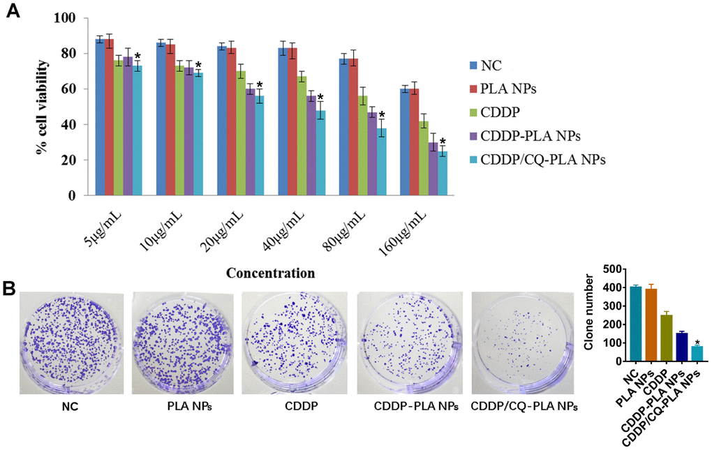 To evaluated the cytotoxicity on OSCC cell. We treated CAL-27 cells with different concentrations of CDDP/CQ-PLA NPs (0, 5, 10, 20, 40, 80, 160 ug/ml). The result of MTT and colony formation showed that CDDP/CQ-PLA NPs had more cytotoxicity than CDDP -PLA NPs and CDDP. (Figure 2A, 2B and Supplementary Figure 1).